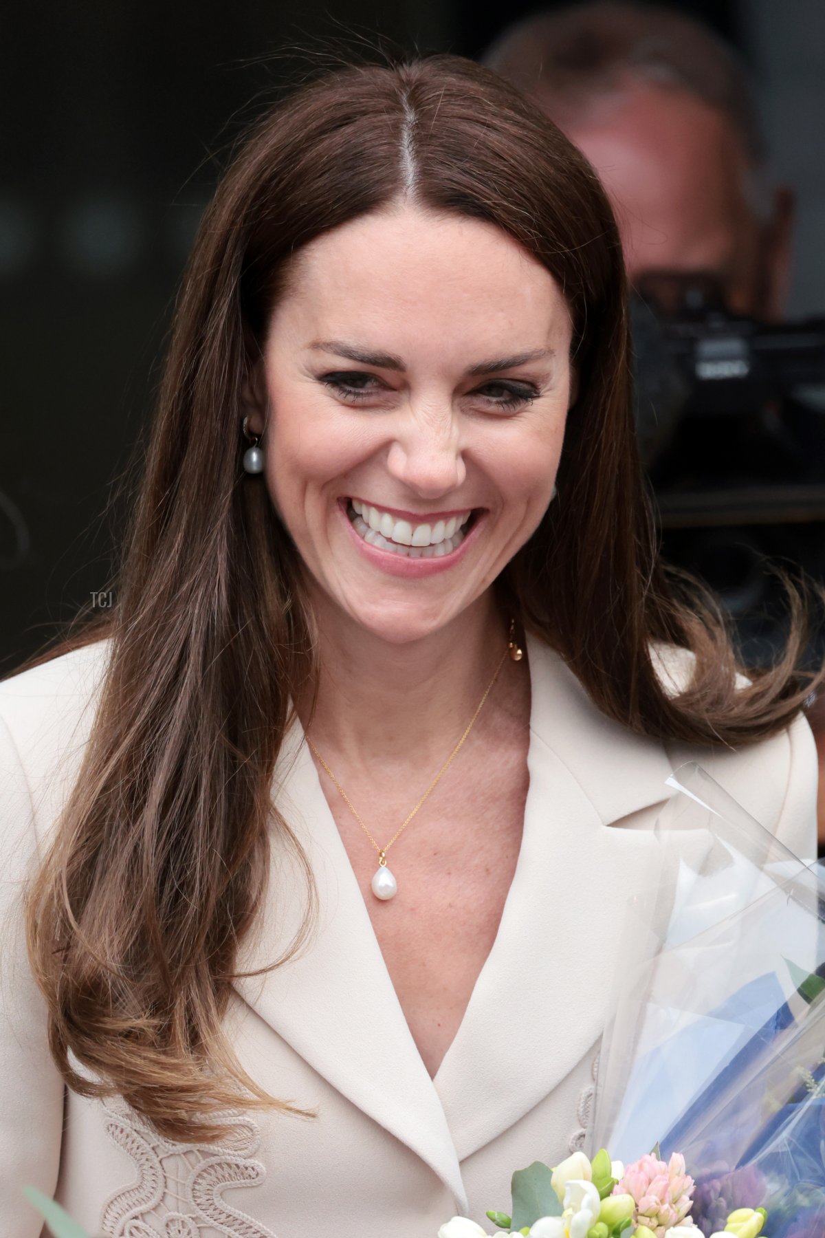 More recently, we saw Kate debut a pearl pendant from the brand. She wears it above in London in April 2022.