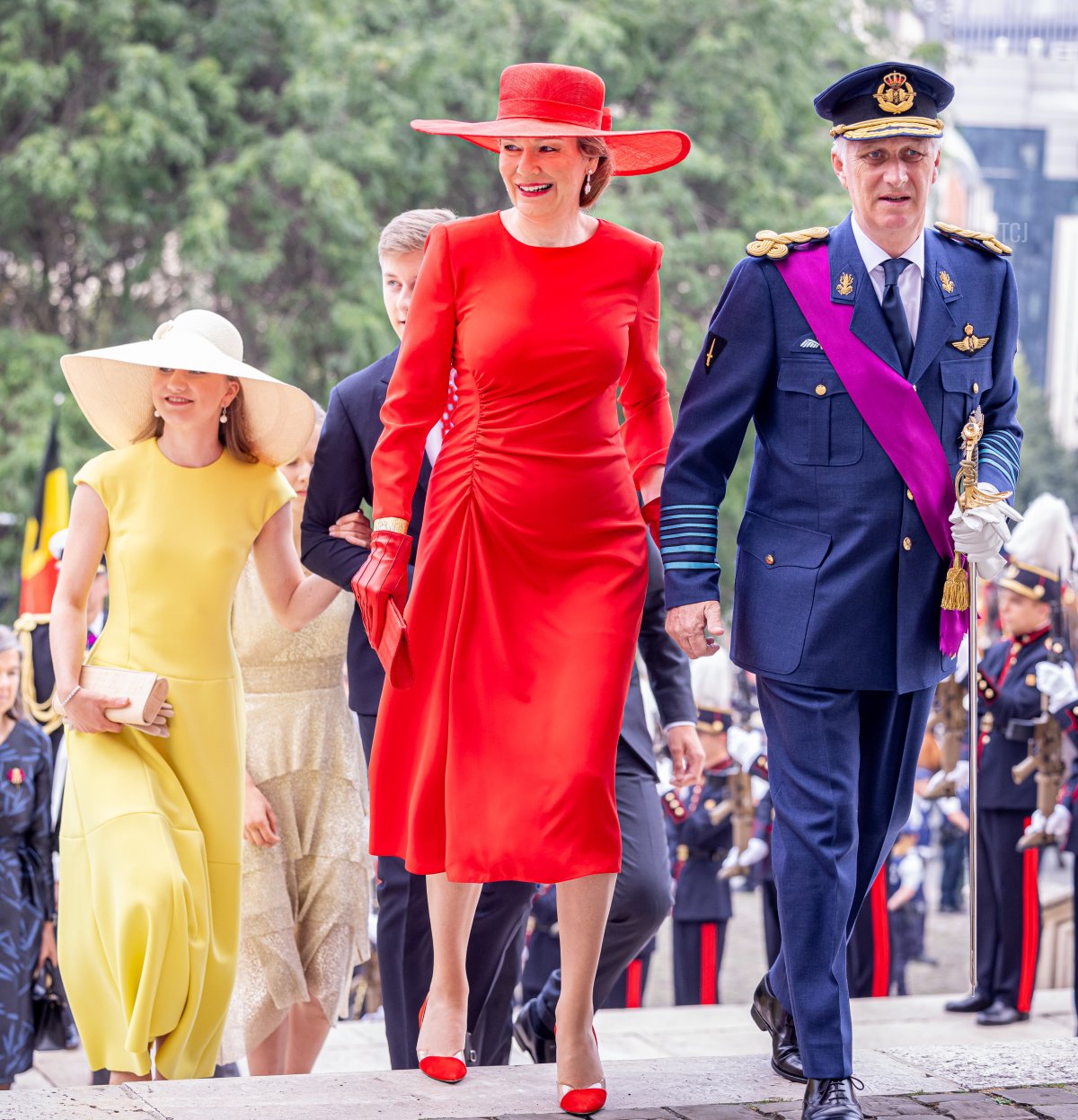For Friday’s mass, Queen Mathilde (in red) and Princess Elisabeth (in yellow) both wore Natan, while Princess Eleonore opted for a dress from Maje.