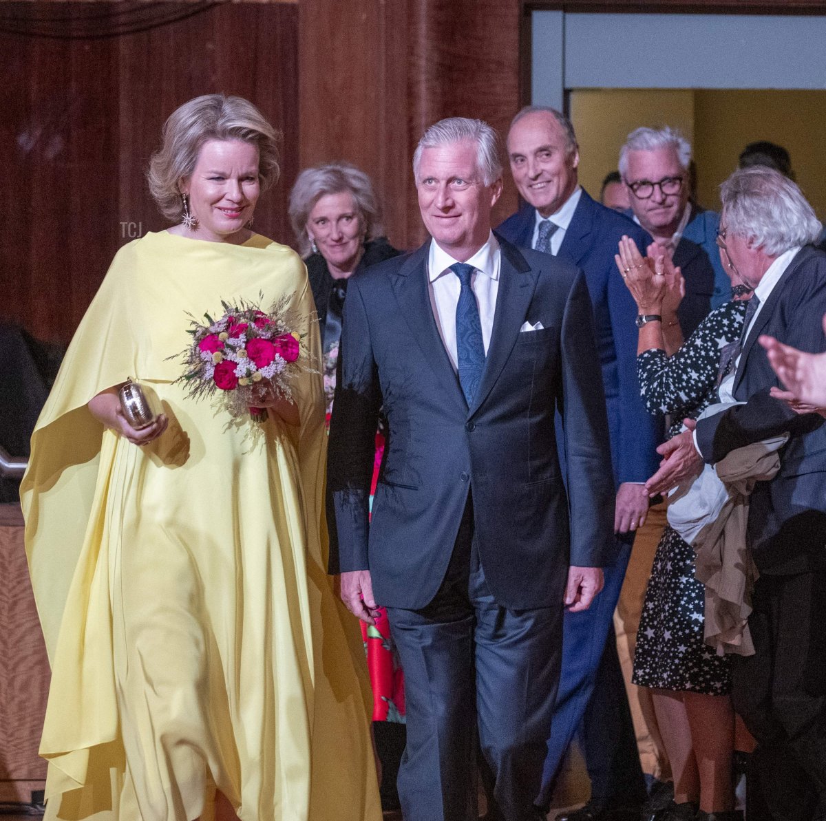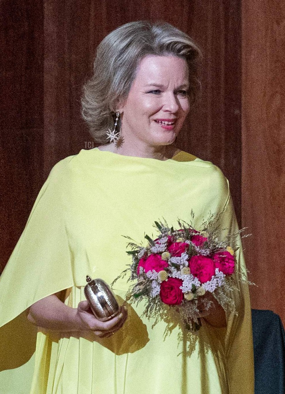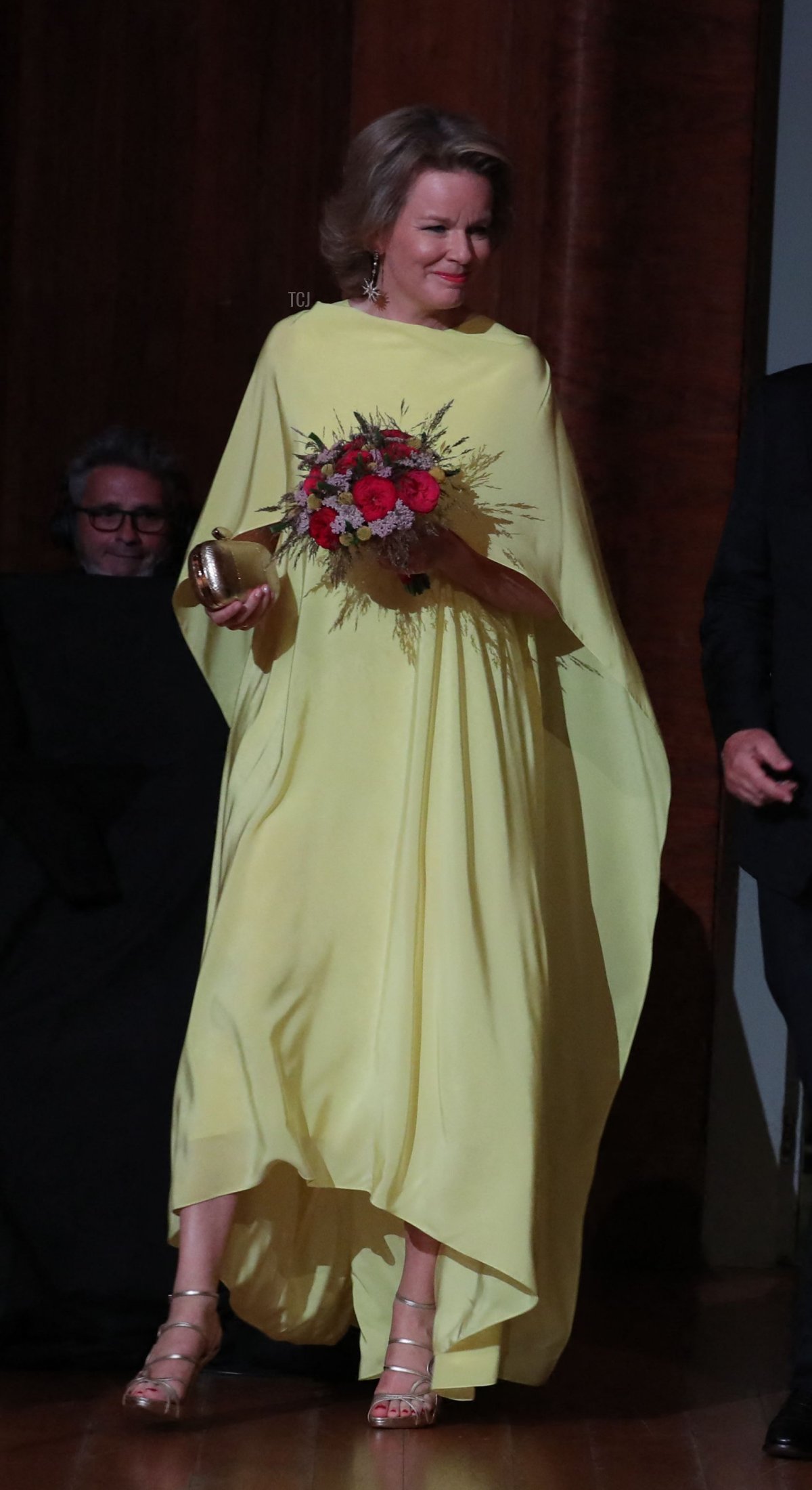 Queen Mathilde wore a bright yellow caftan-style dress for the concert, paired with gold shoes and accessories. She recently wore the same dress during the Queen Elisabeth Voice Competition.
