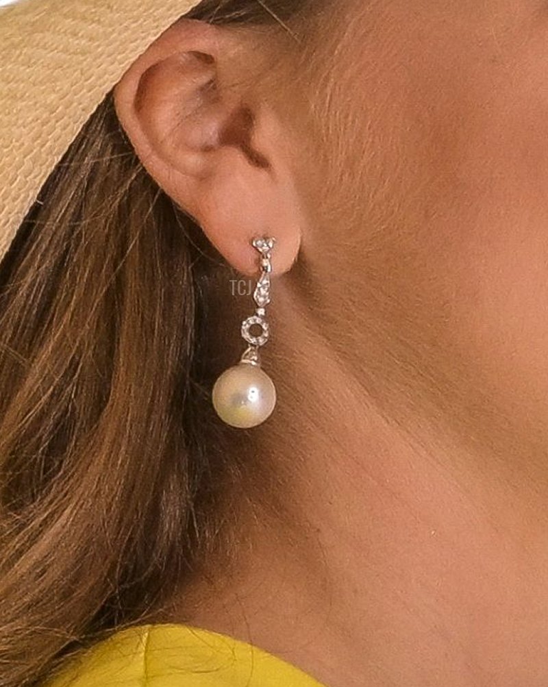 These diamond and pearl drop earrings feature a distinctive circle detail in their design, which helps to quickly visually differentiate them from Queen Fabiola’s Diamond and Pearl Drop Earrings.
