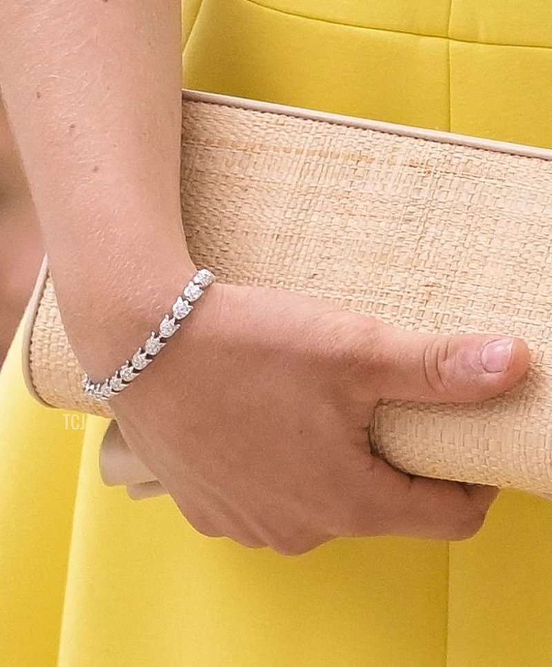 Here’s a closer look at the tennis-style bracelet, which has a floral design. Queen Mathilde wore the same bracelet for Philippe’s inauguration on National Day in July 2013.
