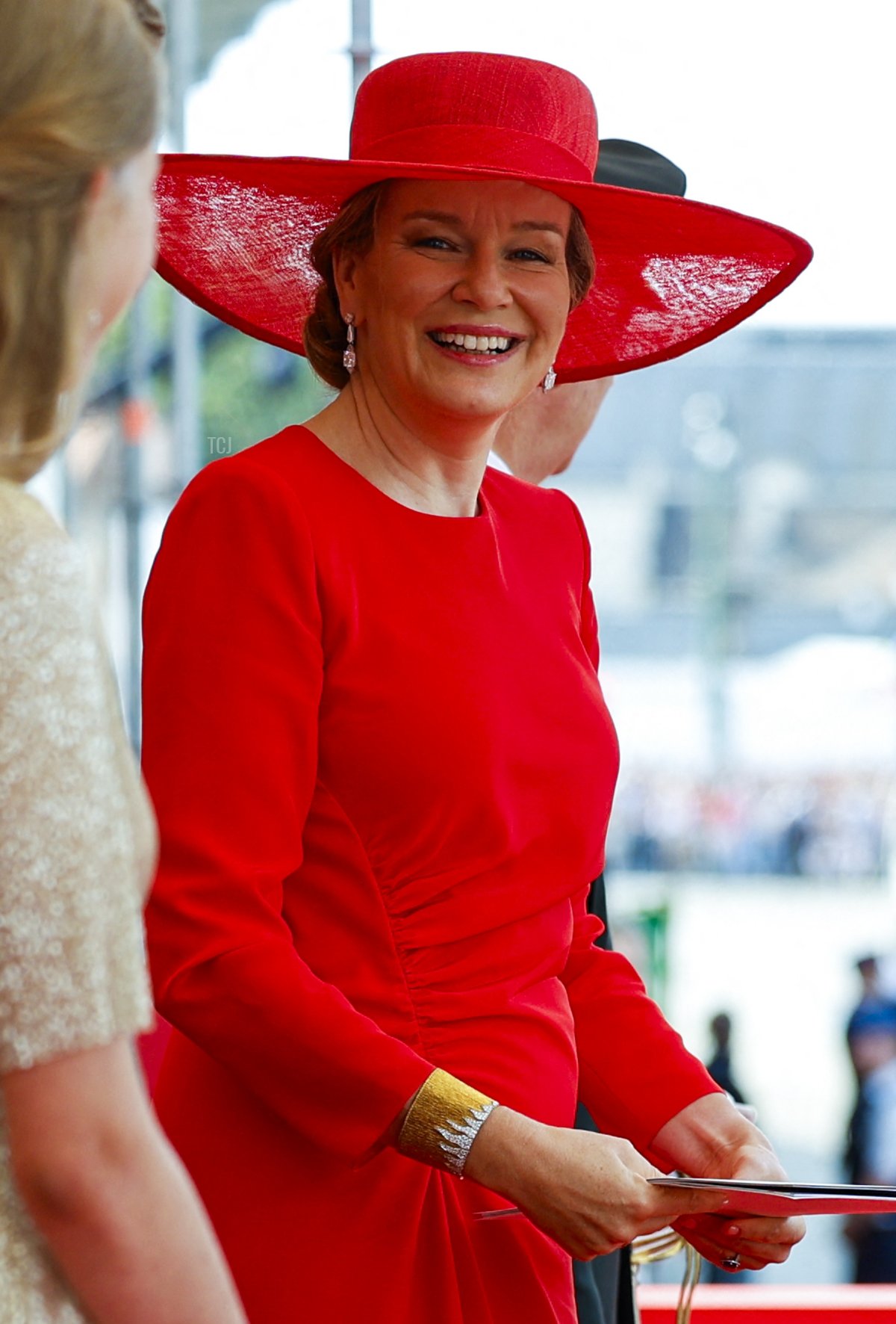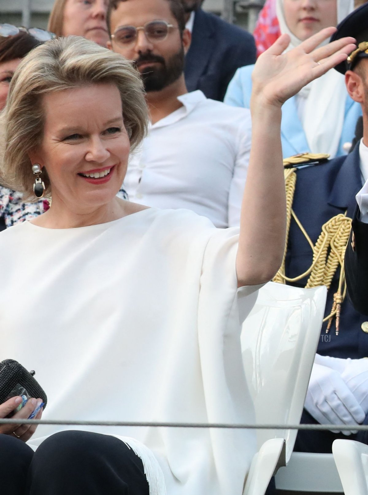 Queen Mathilde chose a black-and-white ensemble for the final moments of National Day, paired with coordinating statement earrings.