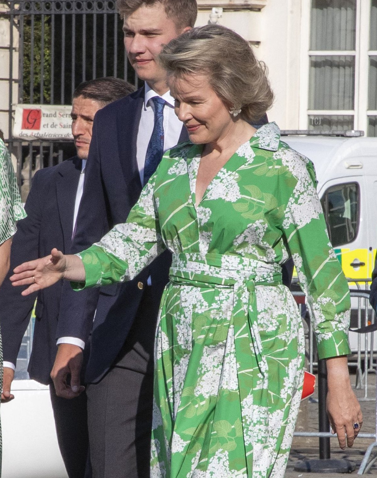 Queen Mathilde kept the floral theme going with her earrings, wearing her beaded jasmine earrings from Carolina Herrera.