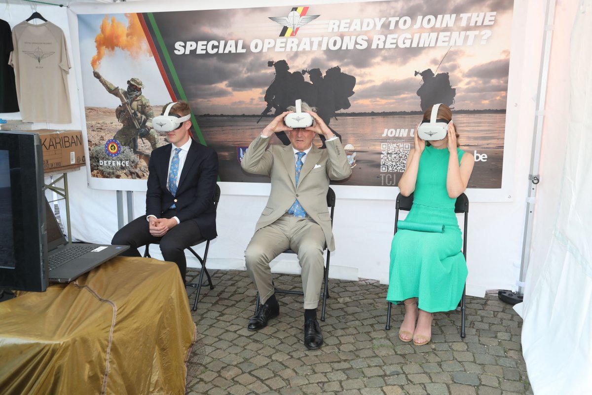 Princess Elisabeth, seen here trying out virtual reality headsets with her father and brother, also wore bright green for the park celebrations.