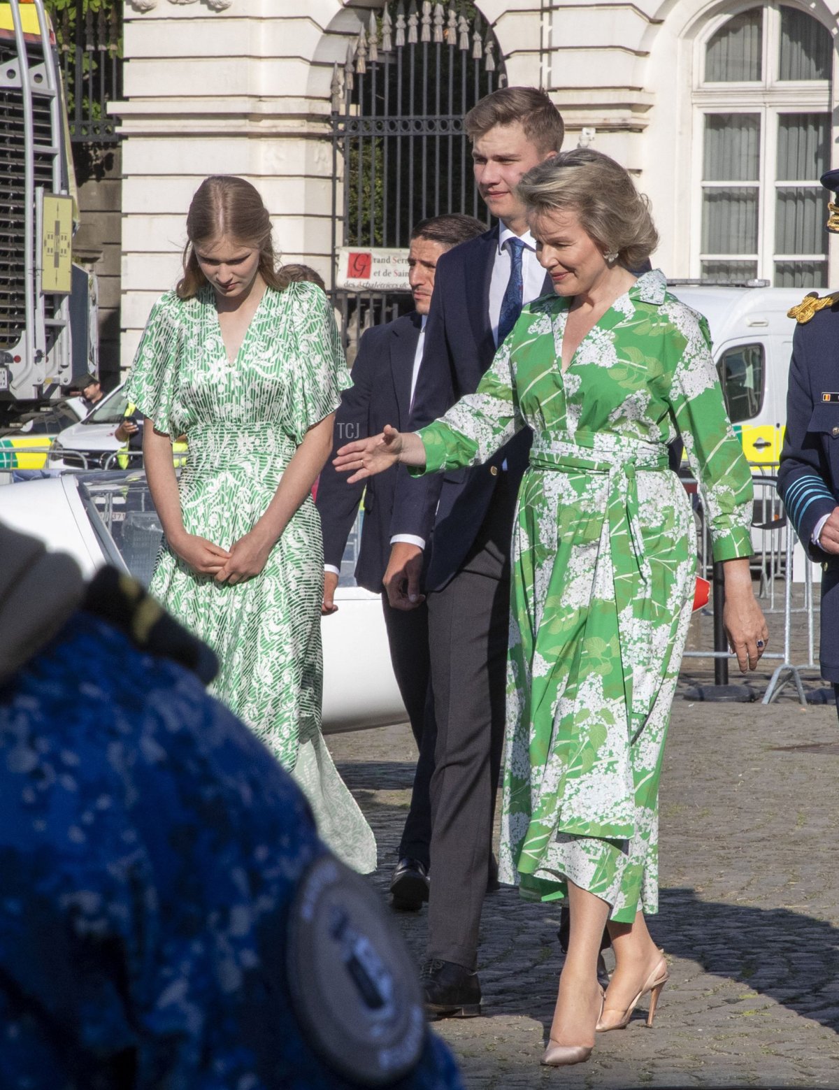 Both Queen Mathilde and Princess Eleonore wore green and white floral printed dresses for the park event.