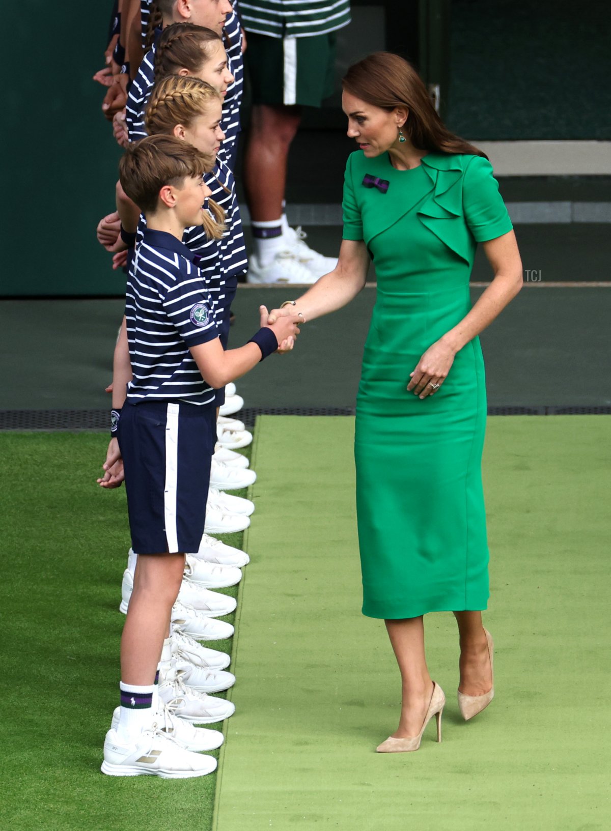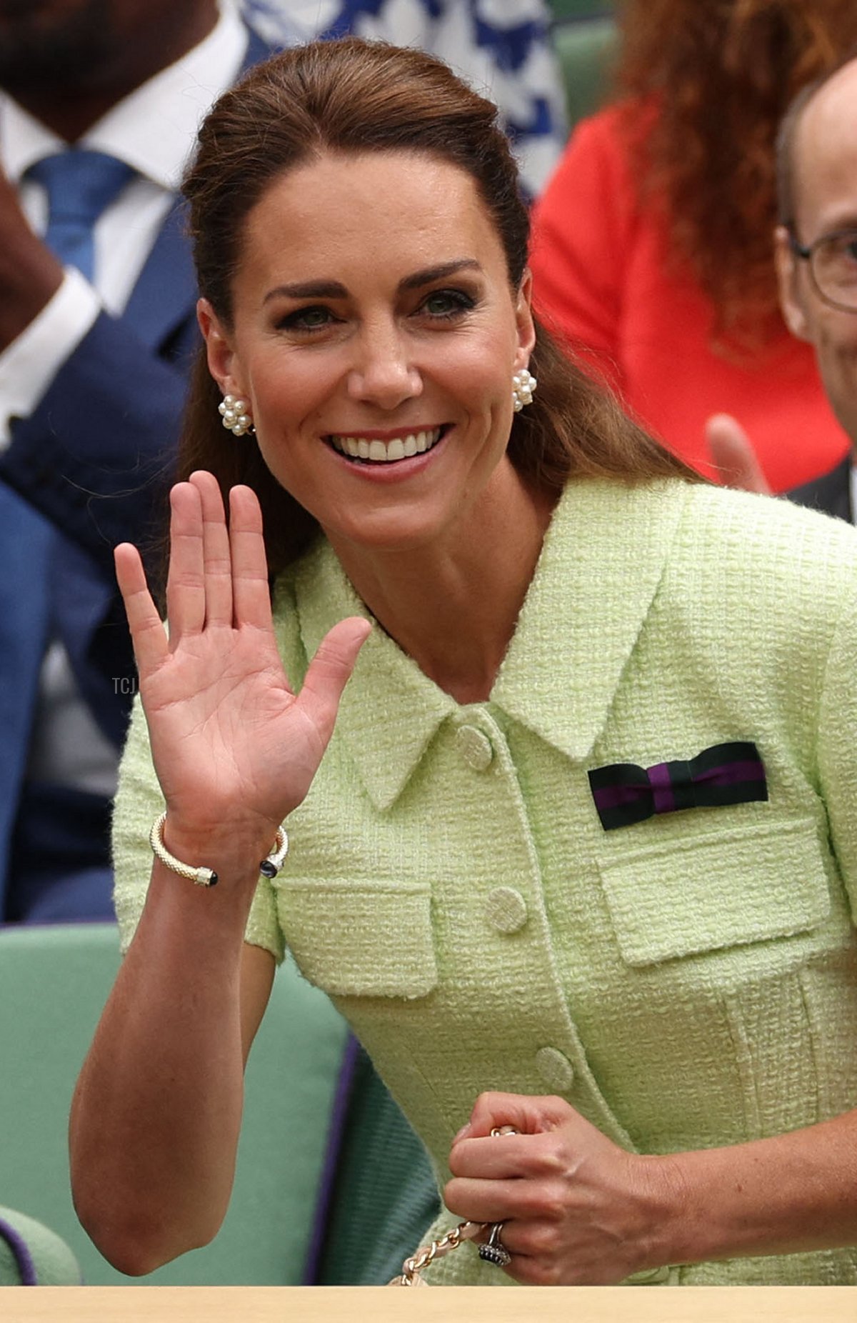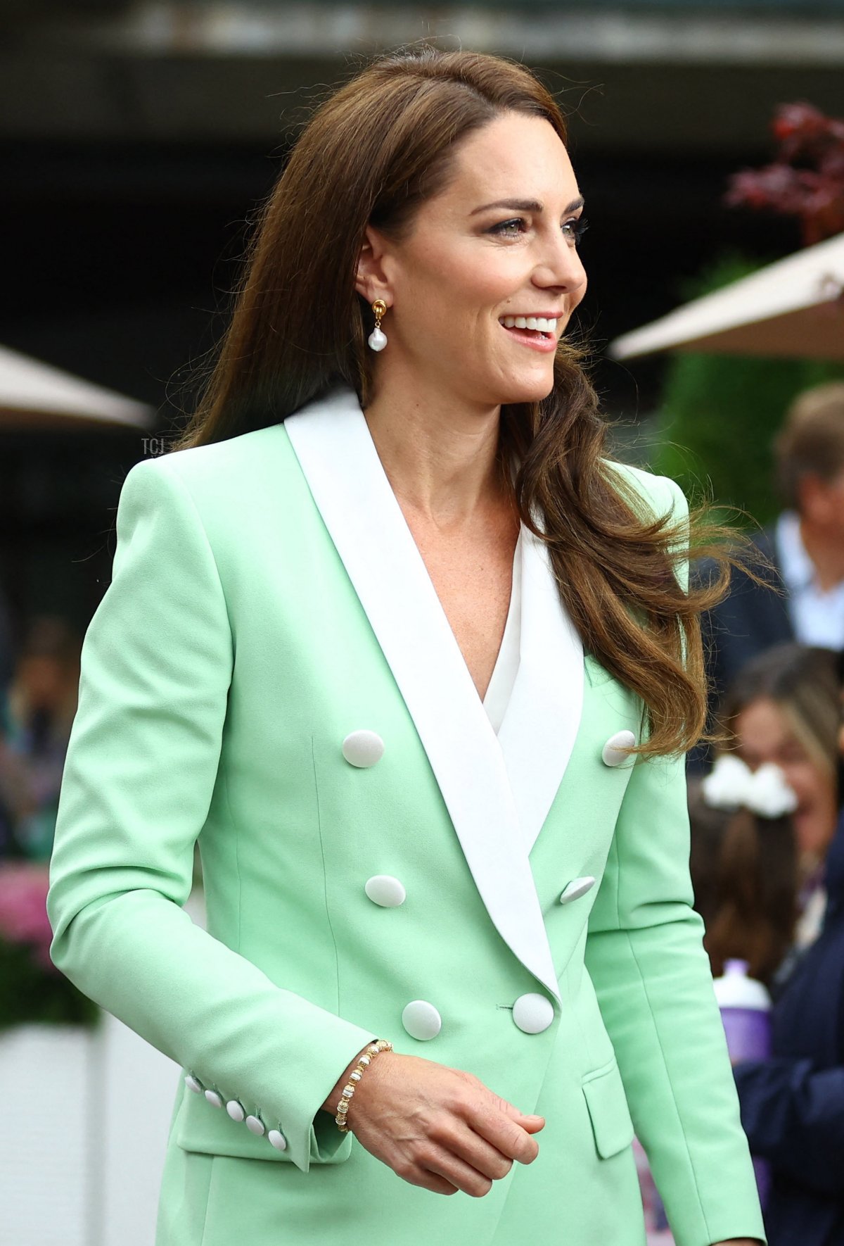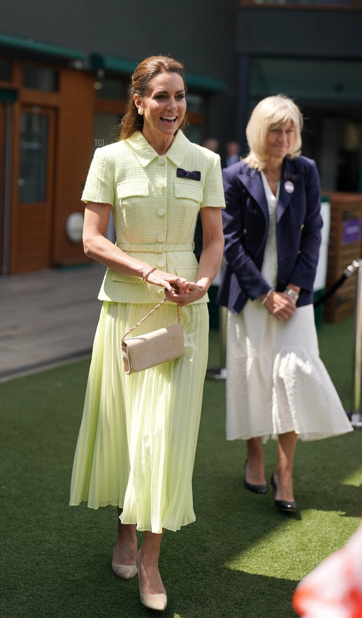 Kate wore a bright spring green ensemble from Self Portrait for the match, with her AELTC member’s ribbon pinned to her jacket.