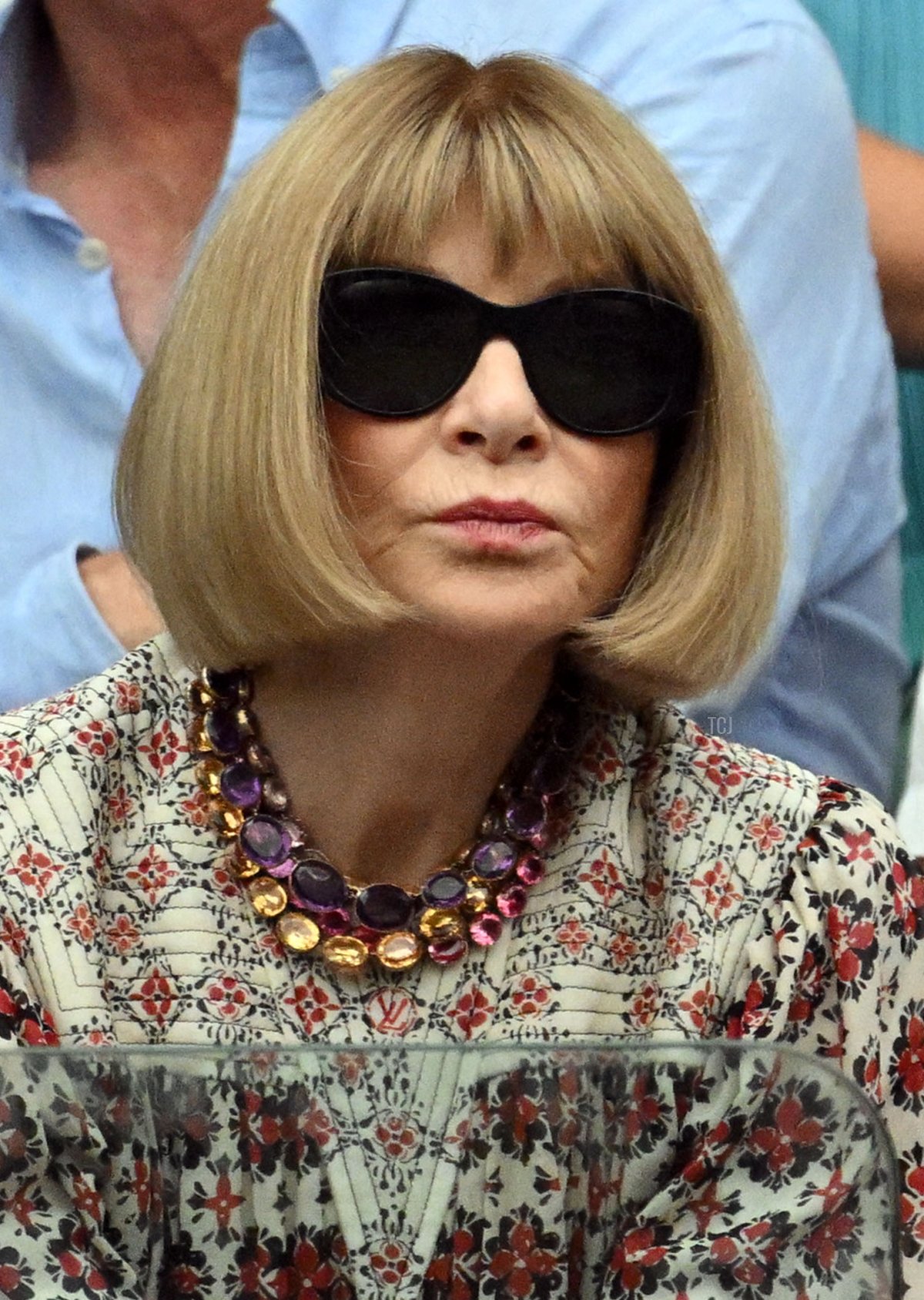 Vogue editor (and noted tennis fan) Anna Wintour has also been photographed more than once at Wimbledon this year, always wearing her signature stack of antique paste necklaces. She wore four necklaces—light purple, pink, darker purple, and gold—to watch Spain’s Carlos Alcaraz play Chile’s Nicolas Jarry on July 8.