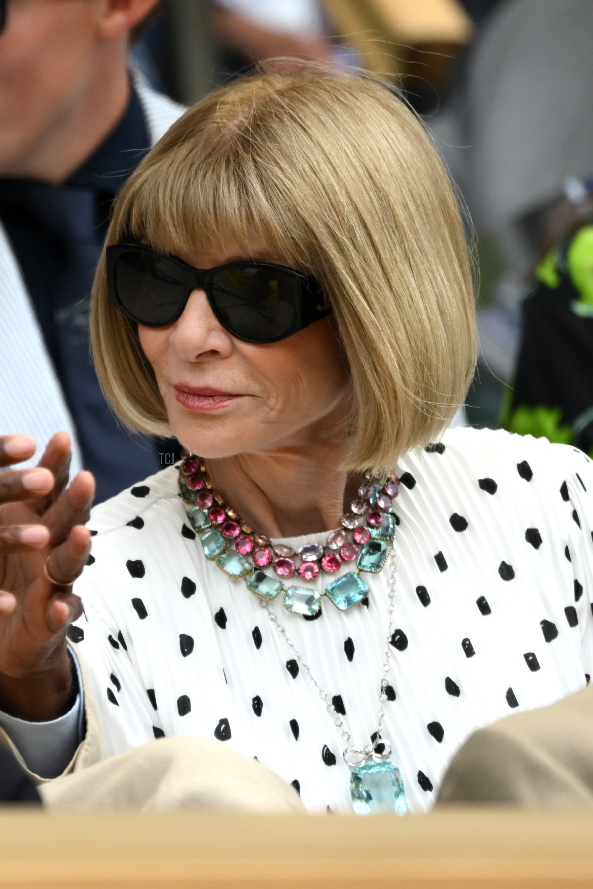 And on July 10, as she watched Beatriz Haddad Maia of Brazil play Elena Rybakina of Kazakhstan, Wintour wore light purple, pink, and blue necklaces, plus a fabulous aquamarine pendant suspended from a long chain with a ribbon detail.
