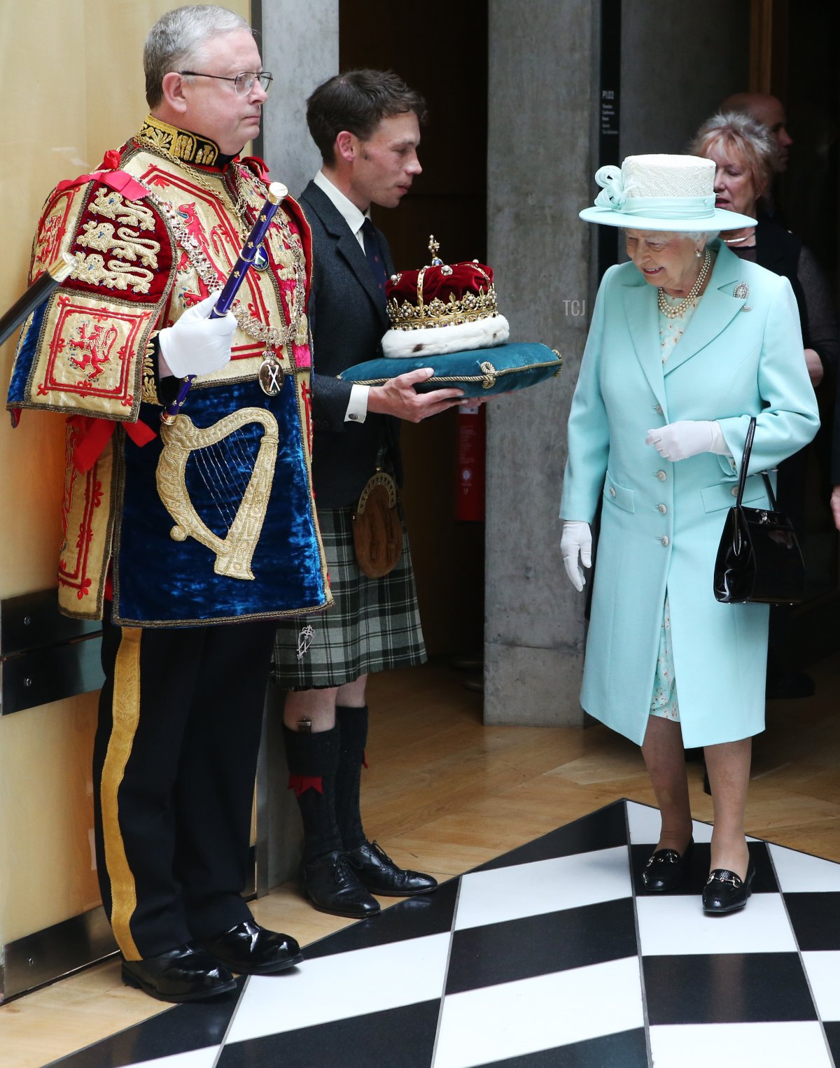 The Queen encountered the Crown of Scotland often during her 70 years on the throne. Above, she glances at the crown, held by the grandson of the man who presented it to her during her coronation year, at the opening of Scotland’s parliamentary session in July 2016.