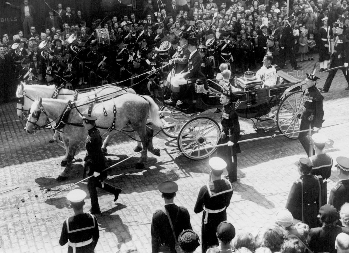Alexander inherited the crown-bearer role along with his dukedoms in 2010 on the death of his father, Angus Douglas-Hamilton, 15th Duke of Hamilton and 12th Duke of Brandon. Angus’s father, Douglas Douglas-Hamilton, 14th Duke of Hamilton and 11th Duke of Brandon, was the one who carried the Crown of Scotland during the last coronation thanksgiving service at St Giles’ Cathedral on June 24, 1953. Above, the 14th Duke rides in a carriage with the crown during a procession along the Royal Mile.