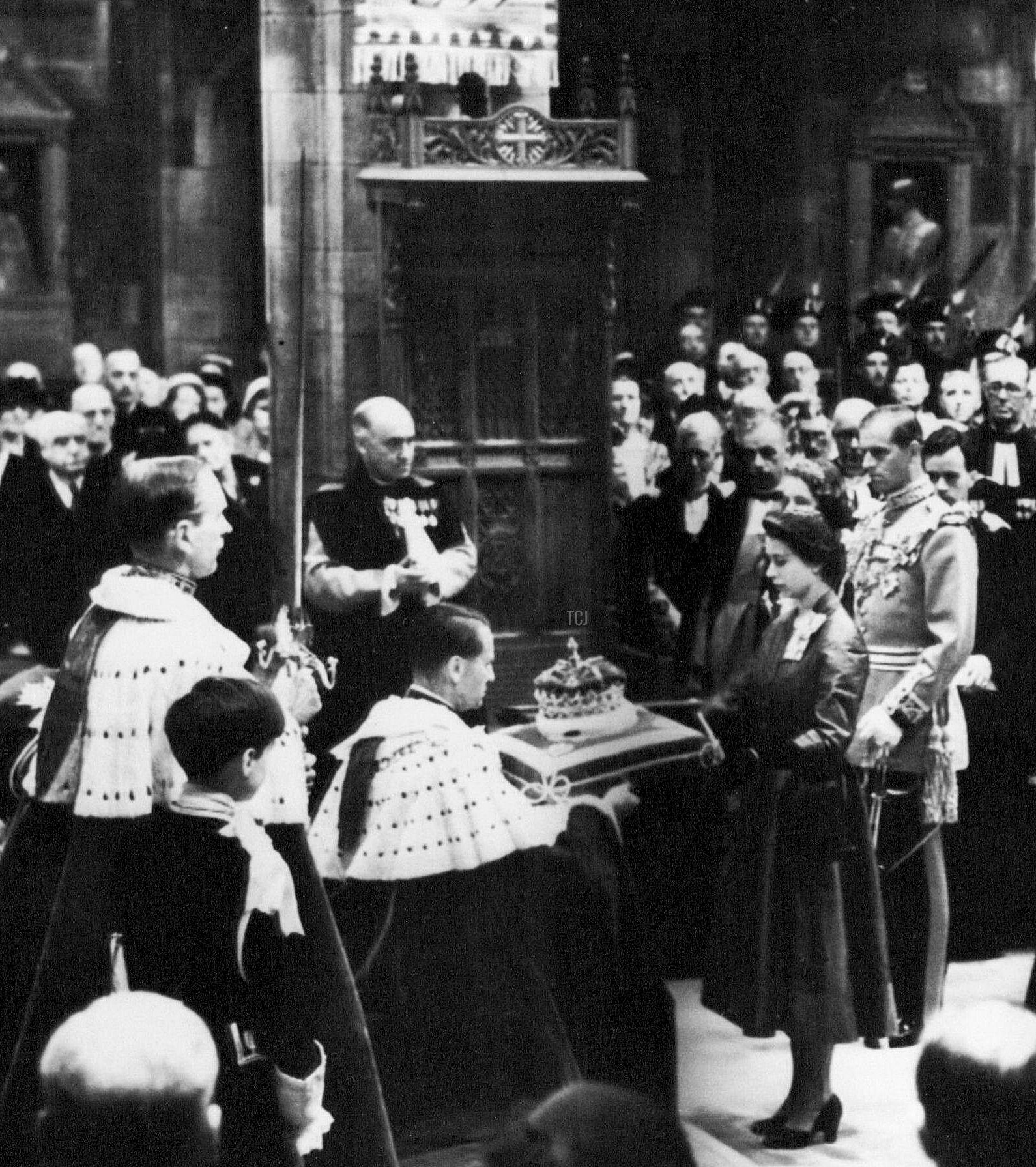 During the service of thanksgiving, the 14th Duke officially presented the crown to Queen Elizabeth II as she received the Honours of Scotland. The Guardian‘s special correspondent wrote that the service took place “in brilliant sunshine.” The Daily Record wrote that the proceedings inside the cathedral were “simple, straightforward, as Scotland likes these things.” The Associated Press reported, “A radiant Queen Elizabeth II received the ancient crown of Scotland at a solemn ceremony Wednesday, but she didn’t wear it. At St Giles’ Cathedral, where she was the central figure in a national service of thanksgiving and dedication, she held the crown for a moment, then handed it back to the robed Duke of Hamilton.”