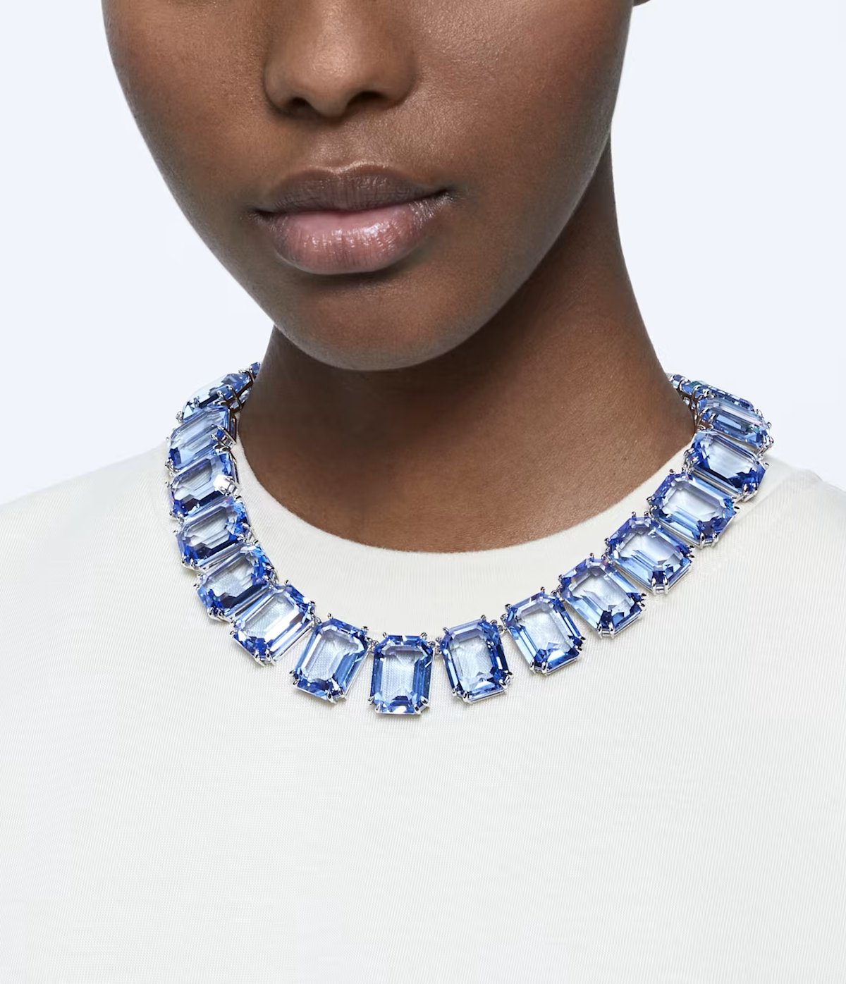 The jewels are from Swarovski’s Millenia collection. Here’s a closer look at the necklace from the brand’s website. The pieces feature blue crystals in rhodium-plated settings.