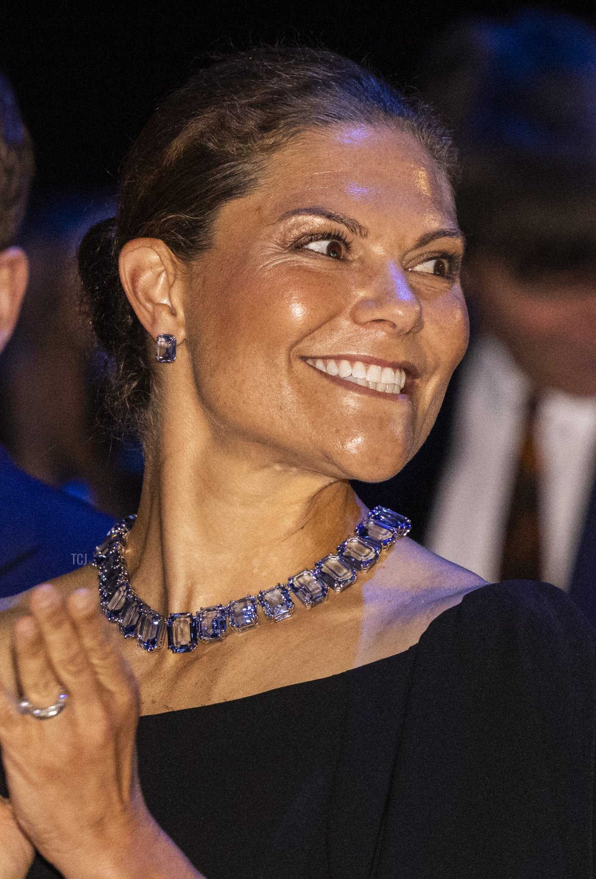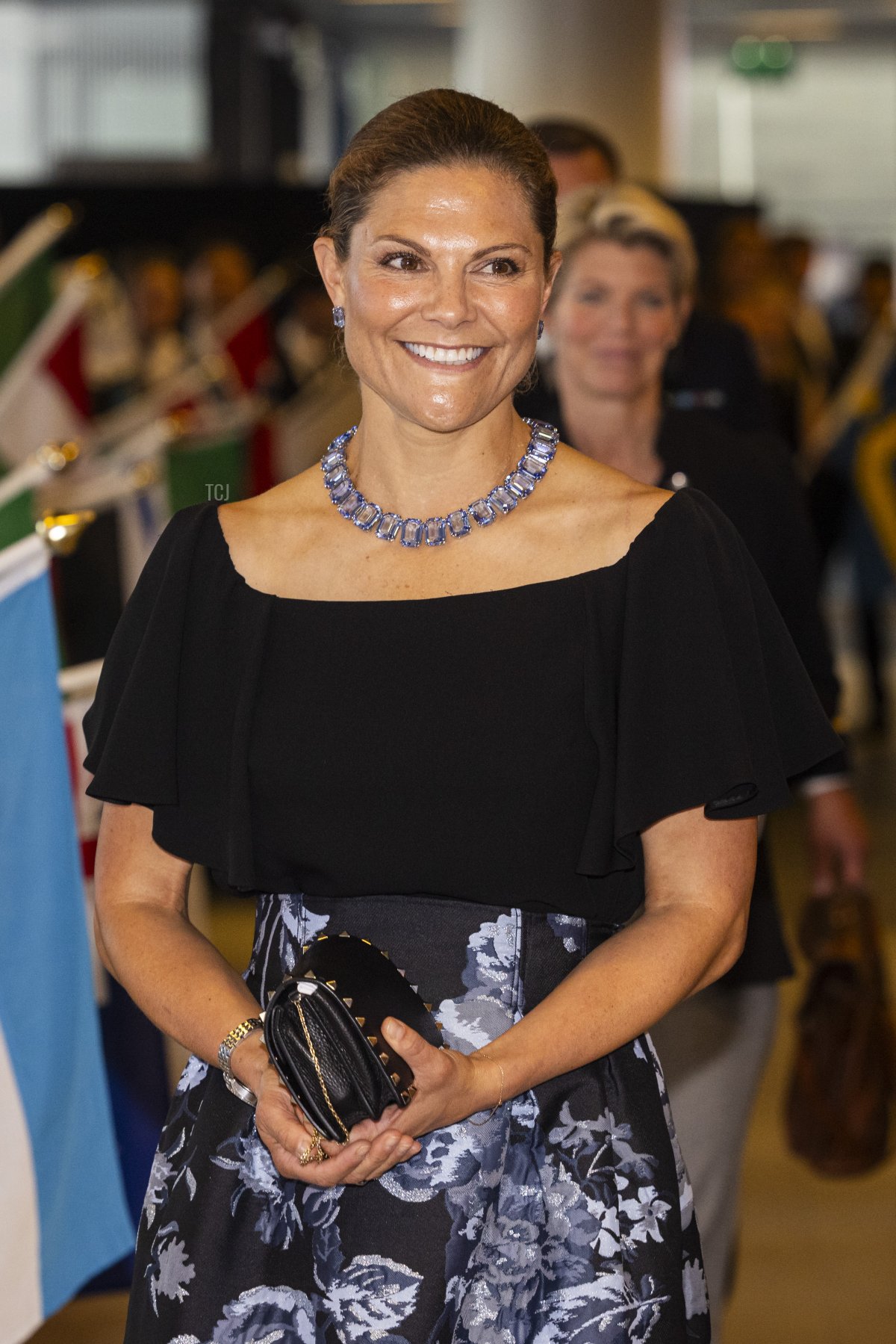 For the Junior Water Prize ceremony, Victoria chose to wear the complete Swarovski suite, pairing the necklace with its matching blue crystal stud earrings.