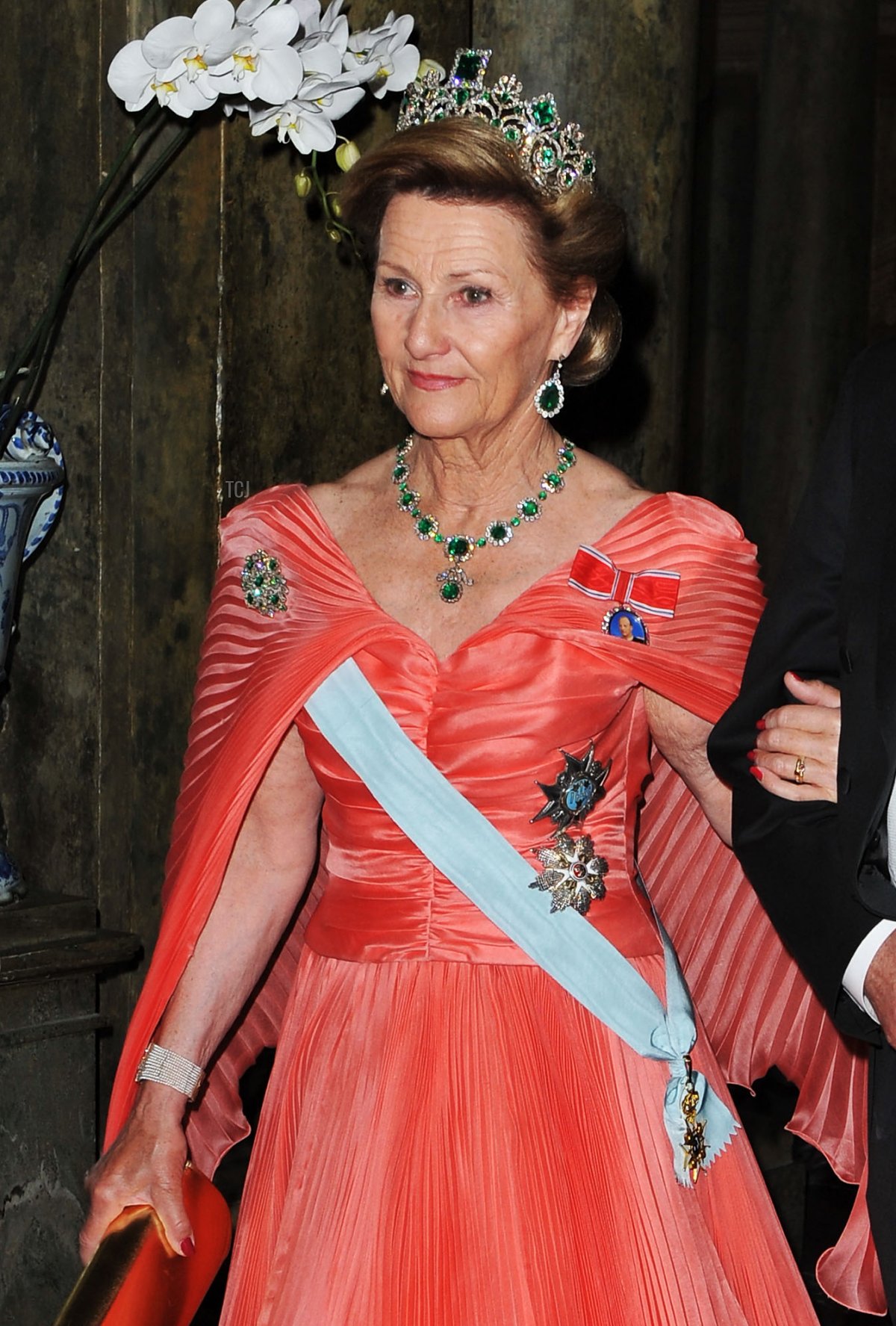 And here, Queen Sonja wears the emeralds for a recent gala dinner at Amalienborg Palace in Copenhagen.