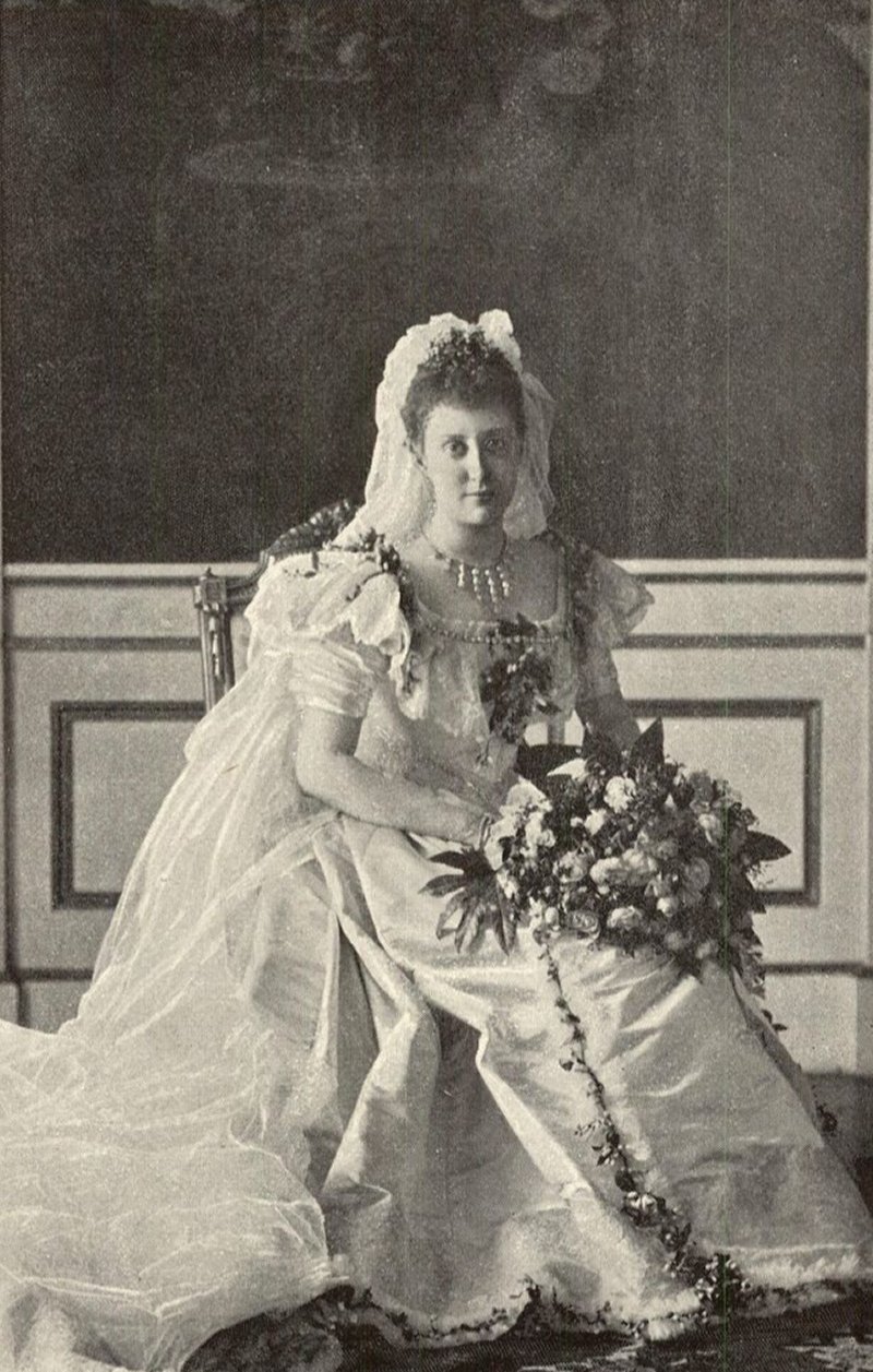 The 19-year-old bride wore a gown of white duchesse satin, trimmed with lace, orange blossoms, and myrtle, with a 12-foot train. She wore a diamond fringe necklace (which could also be placed on a tiara frame) and placed another diamond rivière across her bodice as a corsage ornament.