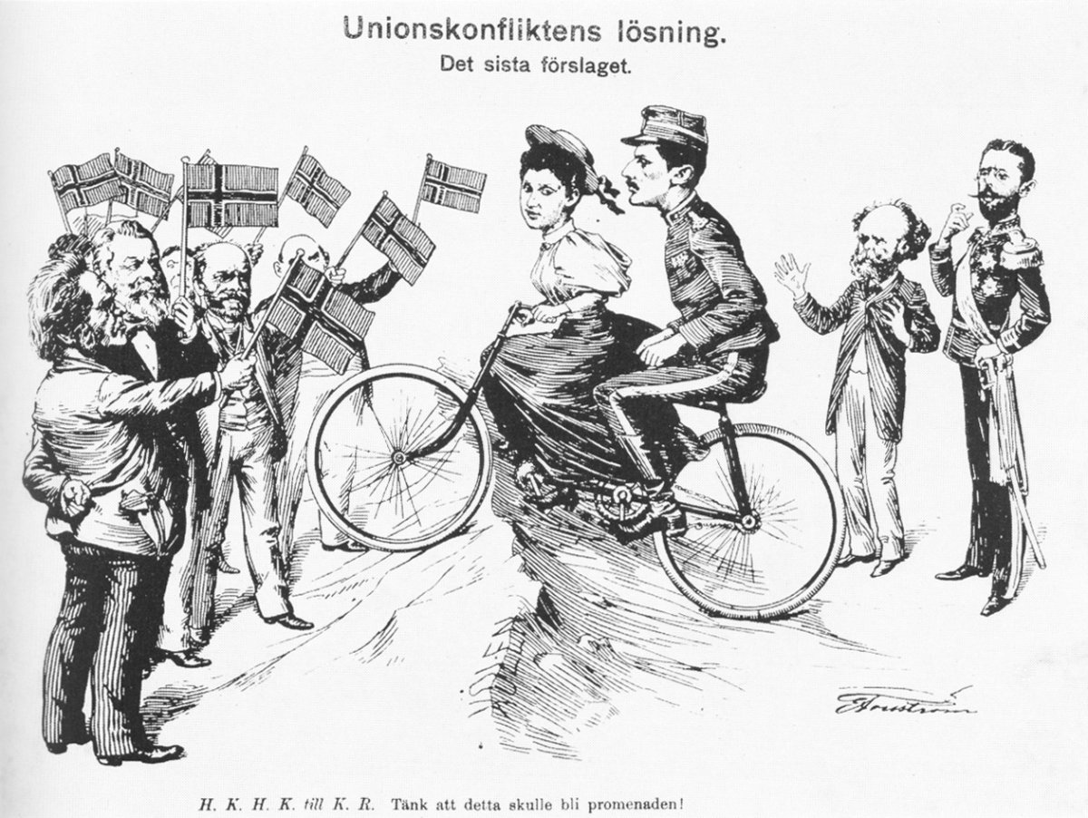 The political cartoon above, which dates to 1897, shows Carl and Ingeborg bicycling over the Scandinavian Mountains, the border between the two countries, where they’re enthusiastically received by the Norwegians, even nationalist figures like Johannes Steen and Bjørnstjerne Bjørnson. The text at the bottom represents the relief that the Swedish royals purportedly felt about the Norwegian reaction to Carl and Ingeborg: “Thanks to them, this will be a walk in the park!”