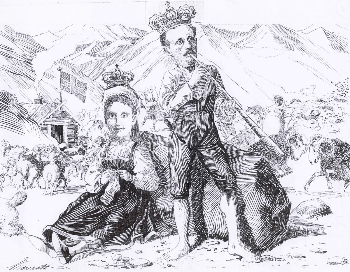 And here’s a second political cartoon from the same period, showing Carl and Ingeborg in Norway, dressed in traditional attire, with Ingeborg knitting and Carl playing a birch trumpet. The bucolic scene depicts the couple again acting as a calming influence, soothing the rams that are butting heads all around them. Historical spoiler alert: the couple’s post-marriage popularity wasn’t enough to keep the Norwegians from seeking independence from the Swedish crown. In 1905, a referendum was held in Norway, and 99.5% of voters chose to dissolve the personal union with Sweden. King Oscar II renounced his claim to the throne of Norway on October 26, 1905.