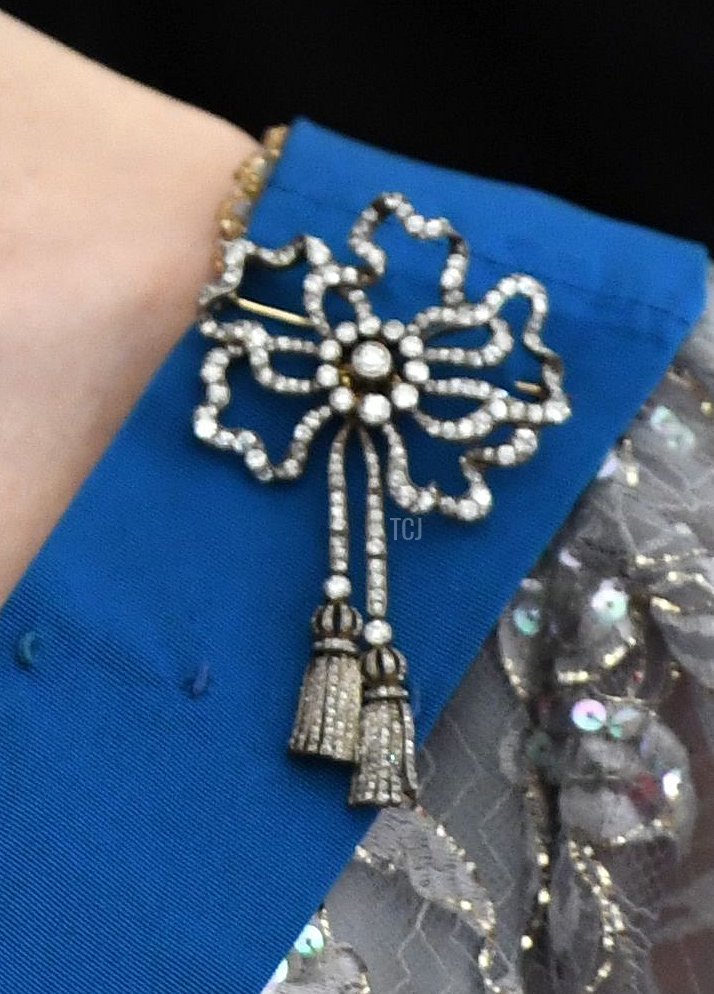Charles gave Anne a diamond ribbon brooch with delicate diamond-set tassels. The five ribbon loops of the brooch, and the diamond cluster set in the center of the jewel, give the brooch a distinctive modern floral shape. (He also gave the couple a more practical gift: two leather gun cases.)