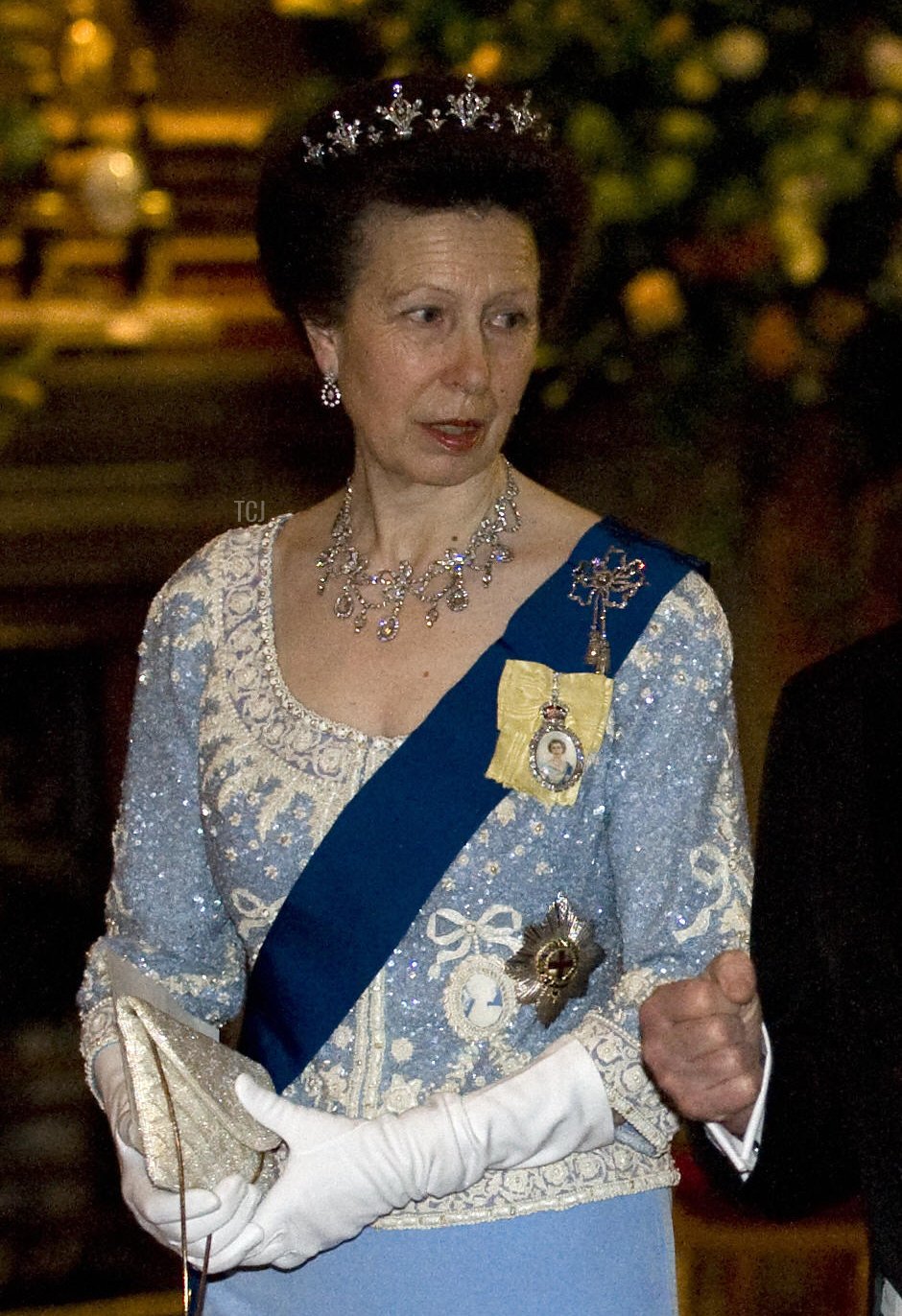 Anne has been wearing the tiara, necklace, earrings, and brooch as a married parure since the 1970s, often appearing in the complete set at gala events like state banquets. She also occasionally wears the brooch separately, or with just the necklace and earrings.