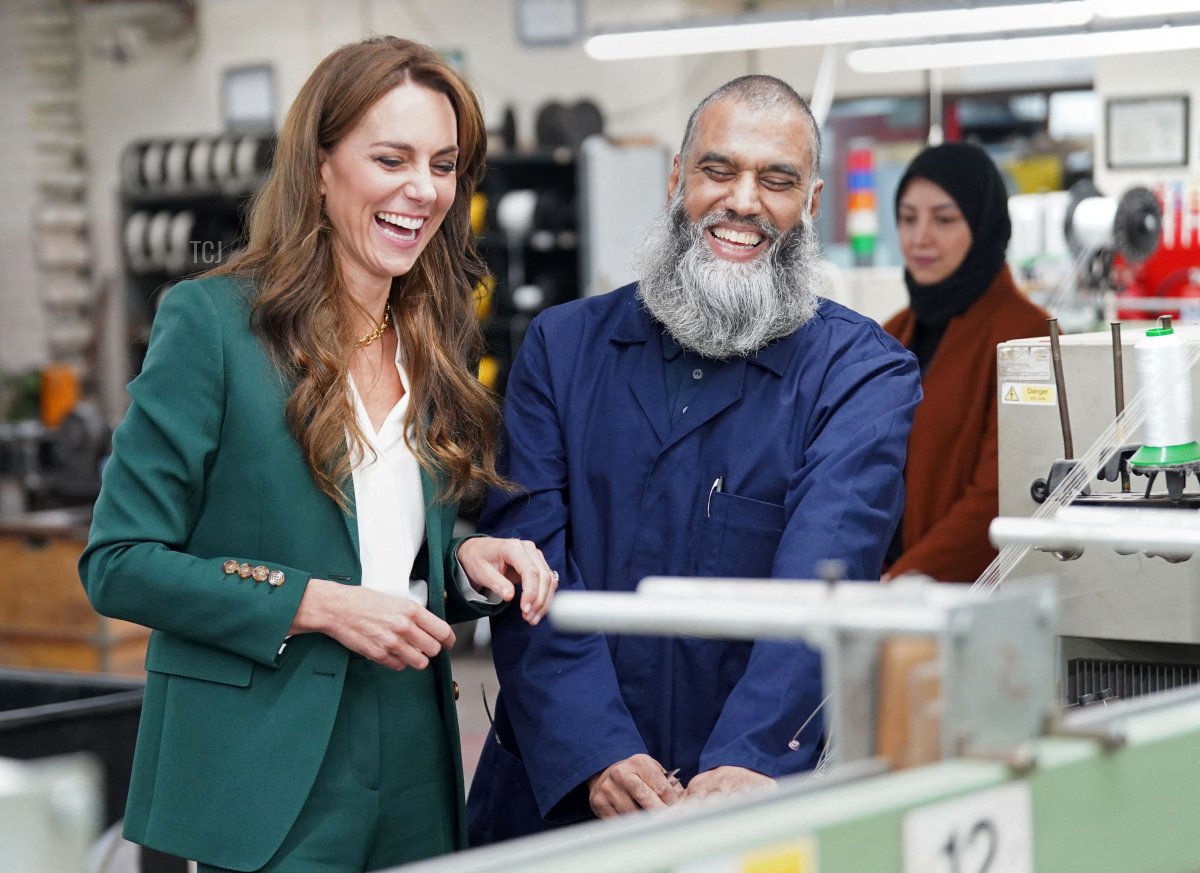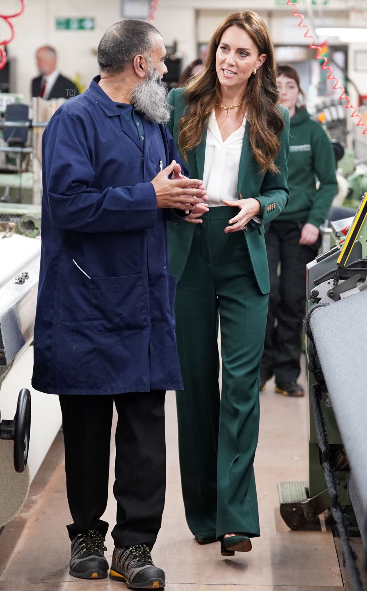 Princess Catherine toured the facilities of AW Hainsworth, a family-owned heritage textile mill in Yorkshire on Tuesday. The company was founded in 1783 by Abimelech Hainsworth, and seven generations later, it’s still owned by the Hainsworth family today. The firm has significant links to Kate’s own family, too. In the eighteenth century, William Lupton & Co. had also been established as a business manufacturing and trading woolen goods in Leeds. One of the family’s descendants, Olive Lupton, married solicitor Noel Middleton, who sold the family textile firm to AW Hainsworth in 1958. Noel and Olive were Kate’s great-grandparents.