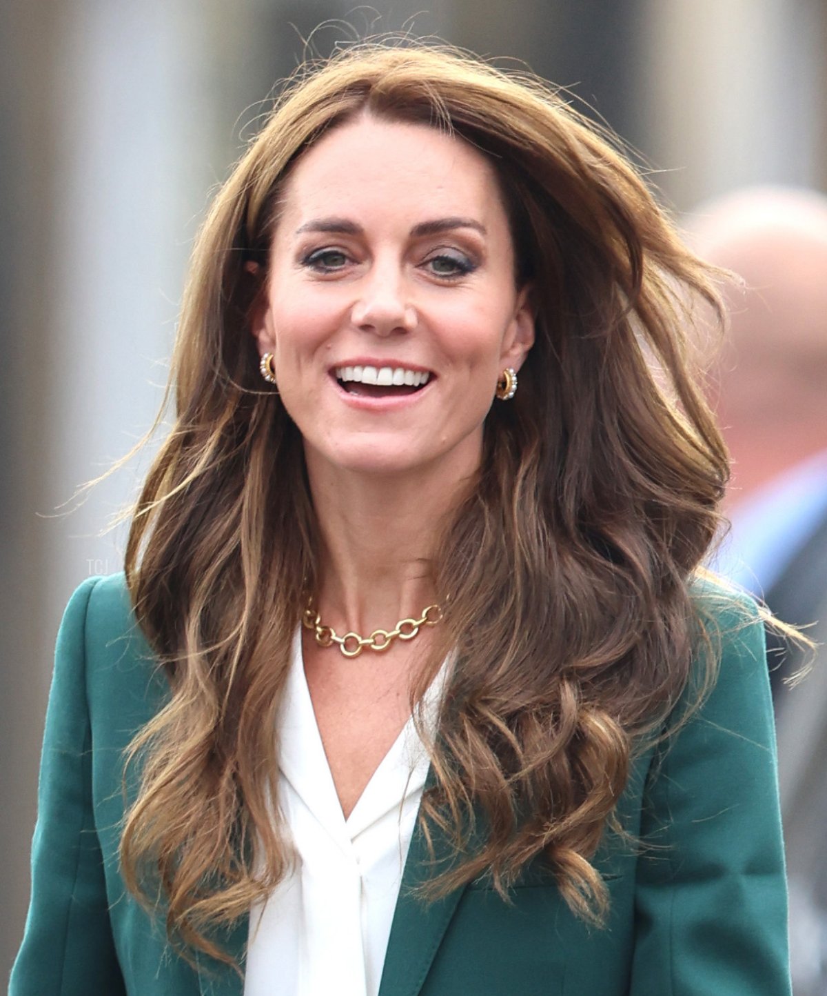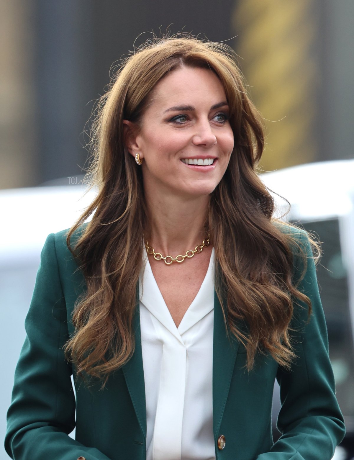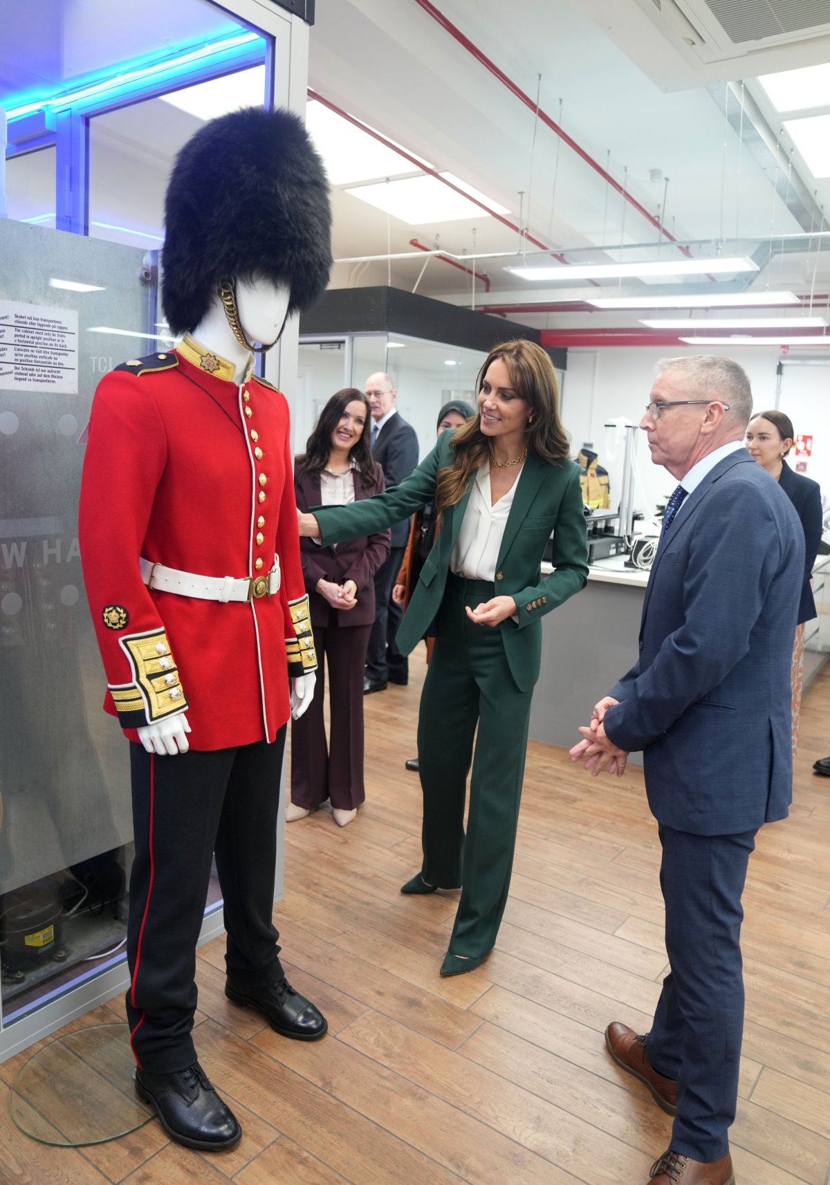 Kate chose a dark green trouser suit made by another British institution, Burberry, for the visit.