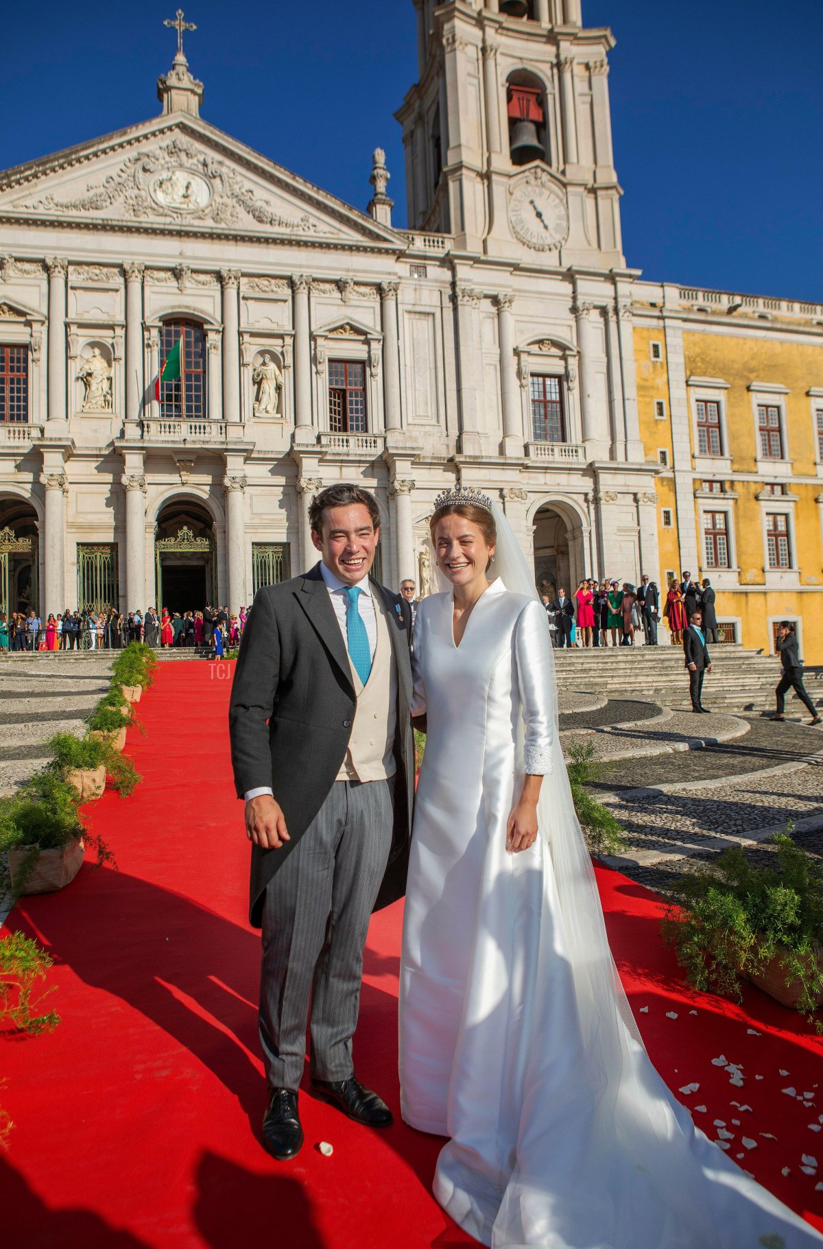 Infanta Maria Francisca de Braganza, the 26-year-old daughter of the Duke and Duchess of Braganza, married Duarte de Sousa Araújo Martins in a ceremony held in the basilica at the Palace of Mafra on Saturday. The ceremony was attended by members of various royal families, both reigning and non-reigning, from all over Europe. Maria Francisca wore an elegant wedding gown made by the designer Luzia do Nascimento with a dramatic veil and gorgeous diamond jewelry.