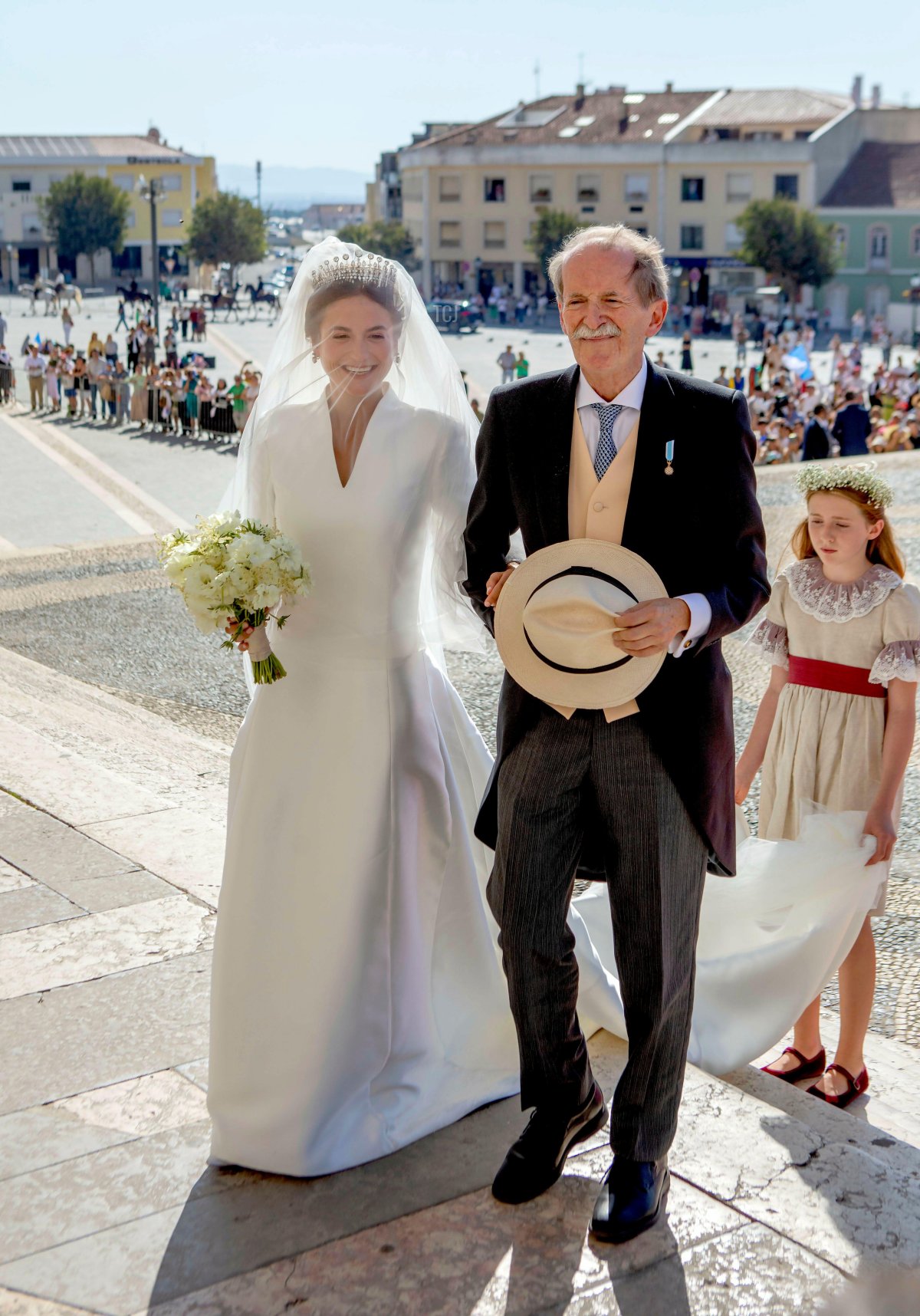 Duarte Pio and his wife, Isabel de Heredia, were married in a glittering ceremony in Lisbon in 1995. They have three children: Afonso, Maria Francisca, and Dinis. The Duke looked like a proud father indeed as he escorted his only daughter to her wedding ceremony on Saturday.