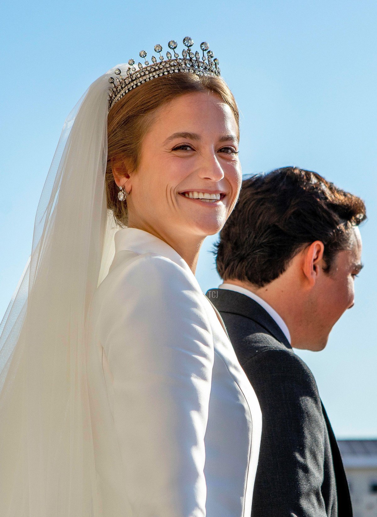 For the wedding, Maria Francisca wore a special tiara with important ties to Portuguese royal history: the King Luis Diamond Tiara. The jewel was made in the 1880s, and it features a series of round brilliants set on a base with a classic nineteenth-century design.