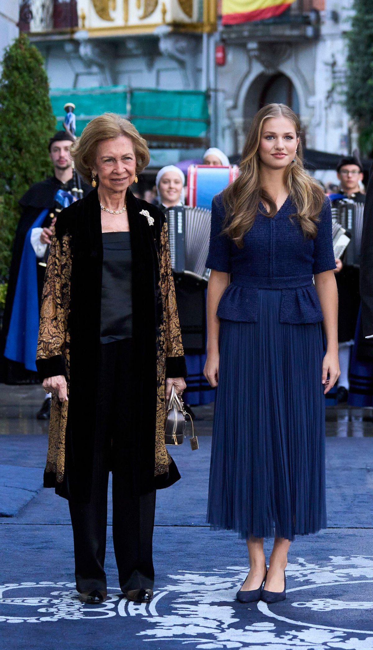 Queen Sofia was elegant in a kimono-style jacket from The Kooples, while Princess Leonor wore a classic navy jacket and skirt from Moises Nieto.