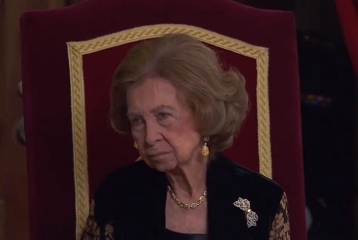 Queen Sofia pared down her jewelry a bit for the occasion. Instead of the layered necklaces that have become her signature in recent years, she wore a single gold necklace with a floral design. She also added earrings with sparkling honey-colored pendants and a diamond bow brooch.