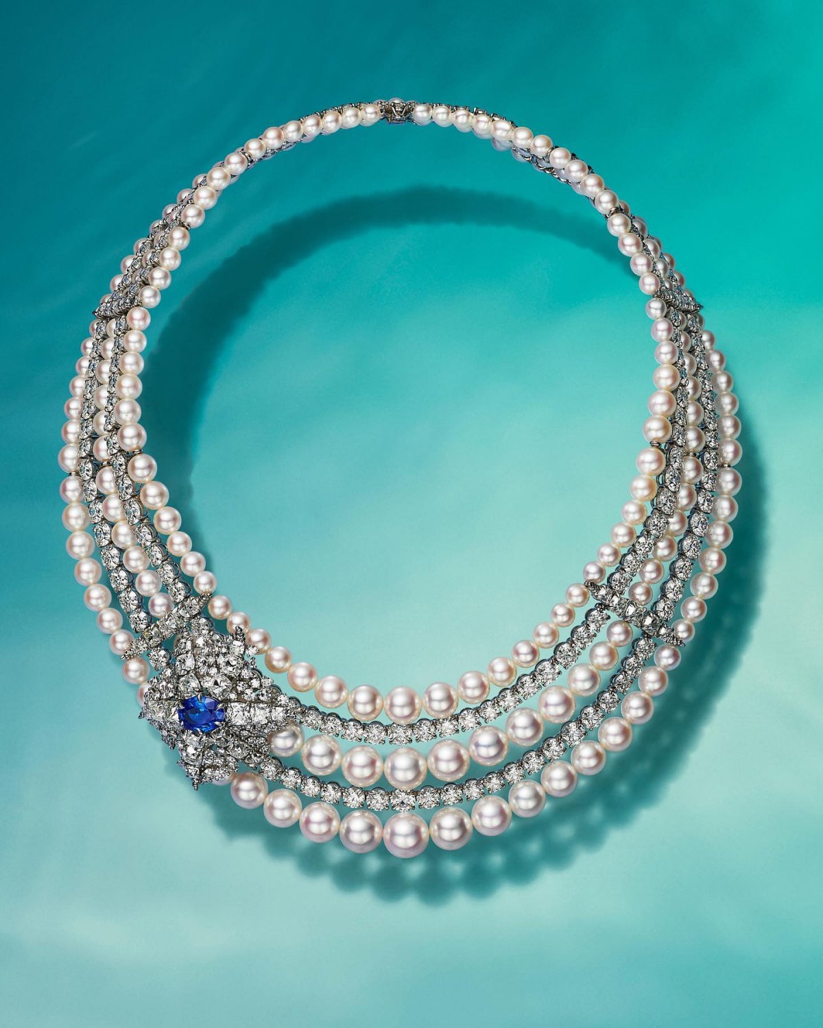 The five-stranded necklace was the piece that grabbed my attention. The jewel is a classic style, the kind found in nearly all royal jewelry boxes around the globe. But the alternating rows of diamonds and pearls give it a fresh new feeling, as does the starfish-shaped platinum and diamond accent, which has a two-carat blue spinel as its centerpiece. In press materials about the necklace, Tiffany & Co. shares that the piece features 54 total carats of cushion-cut and round brilliant diamonds, plus 230 exquisite Akoya pearls.