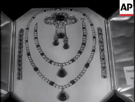 The pearl and emerald necklaces and the diamond and emerald drop earrings both come from a suite of jewelry that was given to Princess Alice, Duchess of Gloucester—the present Duchess’s mother-in-law—to celebrate her royal wedding in 1935. The jewels were part of the wedding present offered to Alice by her new parents-in-law, King George V and Queen Mary.