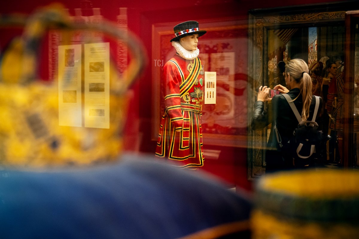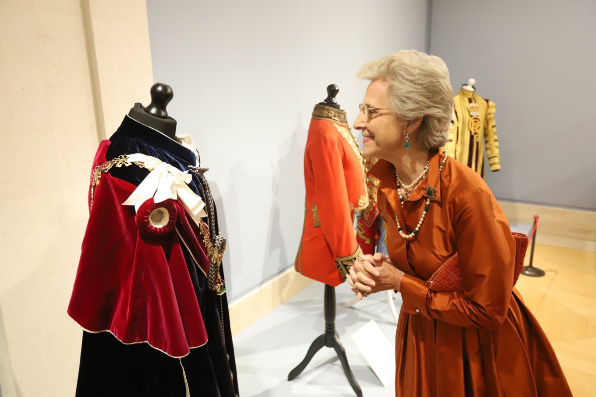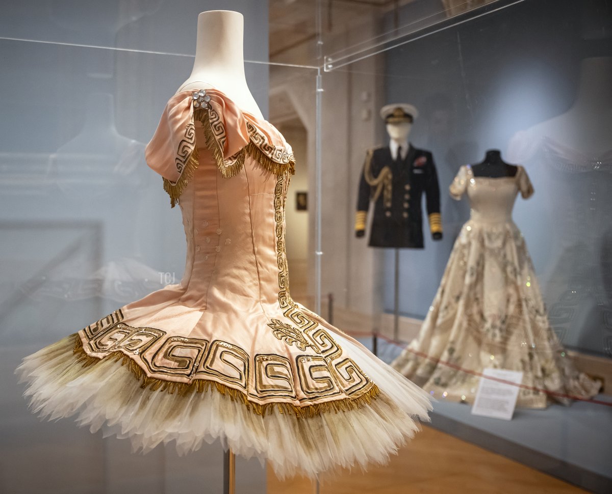 Costumes from various artistic productions are featured as well. Here, a costume from the ballet Sylvia, worn in 2004 by Dame Darcey Bussell, is displayed near costumes from The Crown.