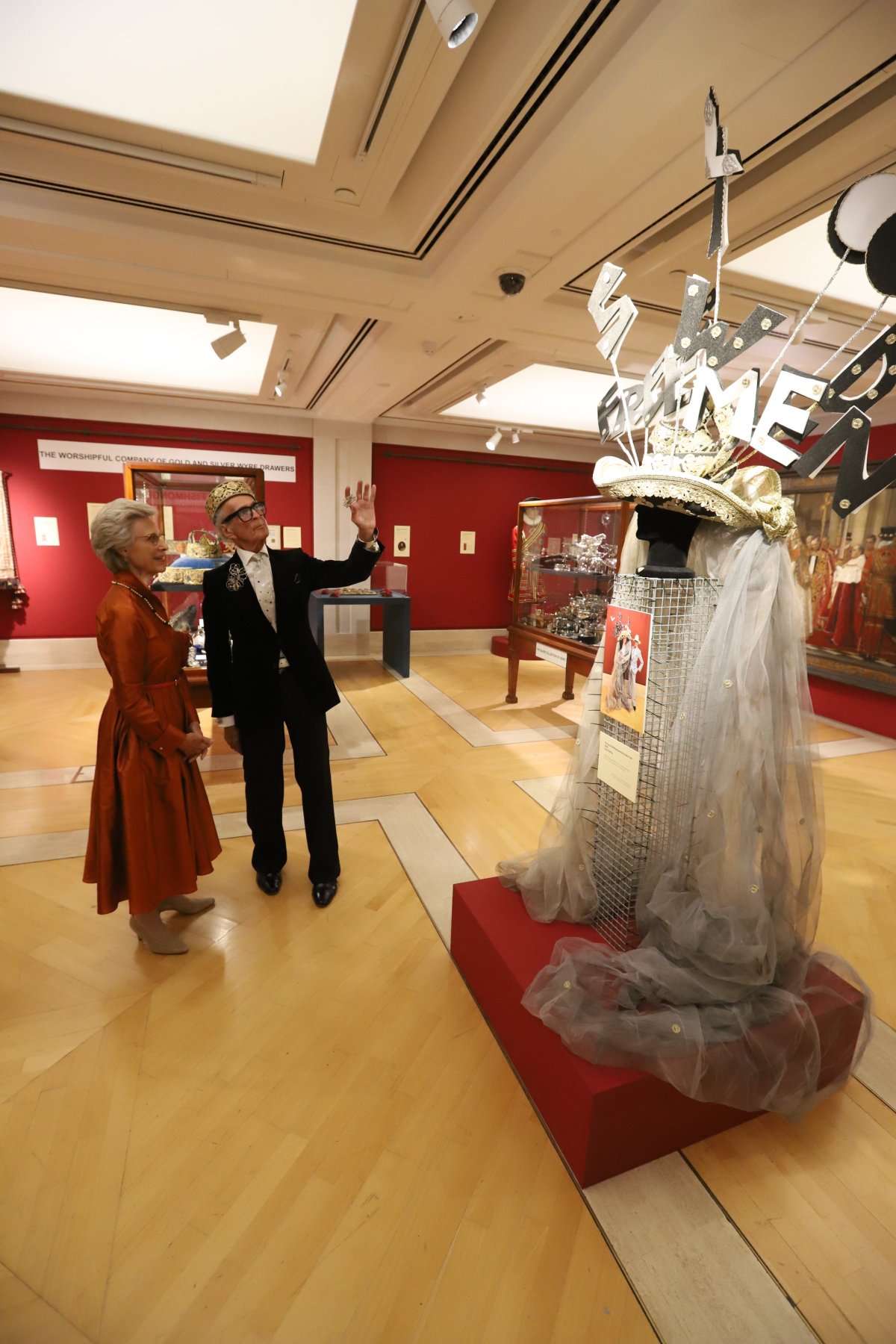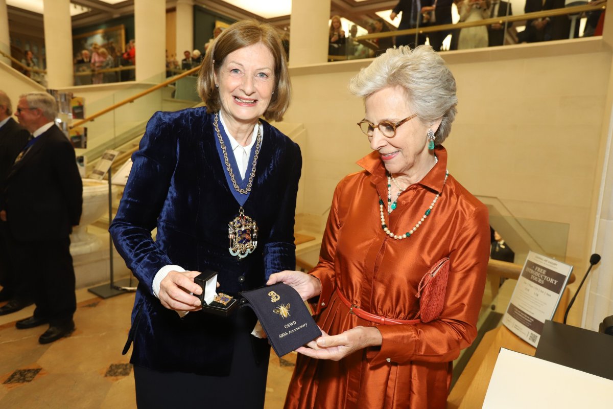 During the exhibition opening, the Duchess of Gloucester received gifts to mark the 400th anniversary of the Gold and Silver Wyre Drawers, including a brooch featuring the company’s coat of arms with supporters.