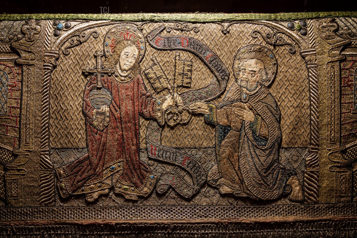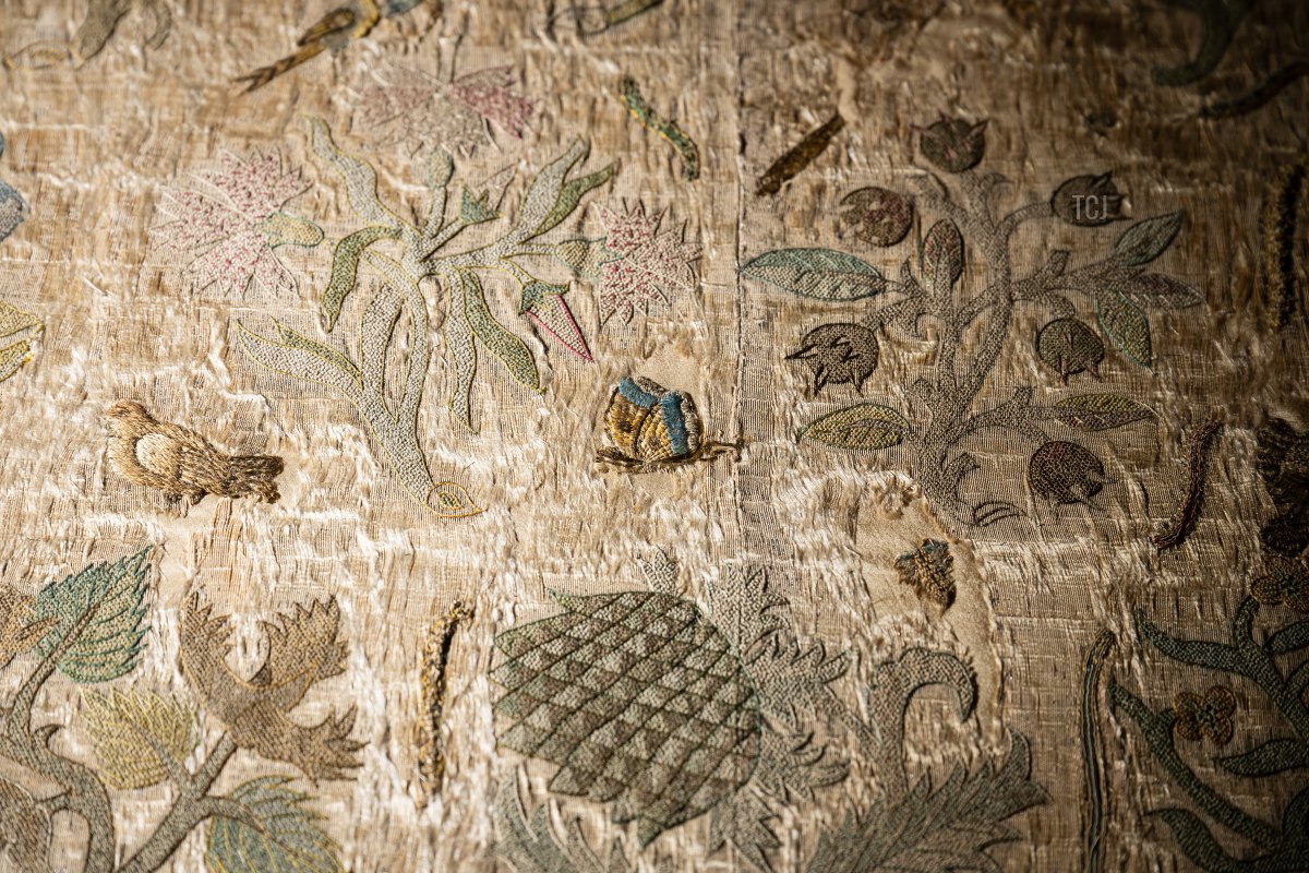 The remarkable Bacton Altar Cloth is included in the exhibition as well. The altar cloth, which dates to the 1590s, has been used by St. Faith’s Church in Bacton, Heredfordshire, for centuries. But it was more recently discovered that the altar cloth is particularly special: it was made by repurposing embroidered fabric that was once part of a dress owned by Queen Elizabeth I. It’s very similar to the embroidered dress that Elizabeth is pictured wearing in the famous Rainbow Portrait. The cloth is the only known surviving piece of dress fabric worn by Elizabeth I.
