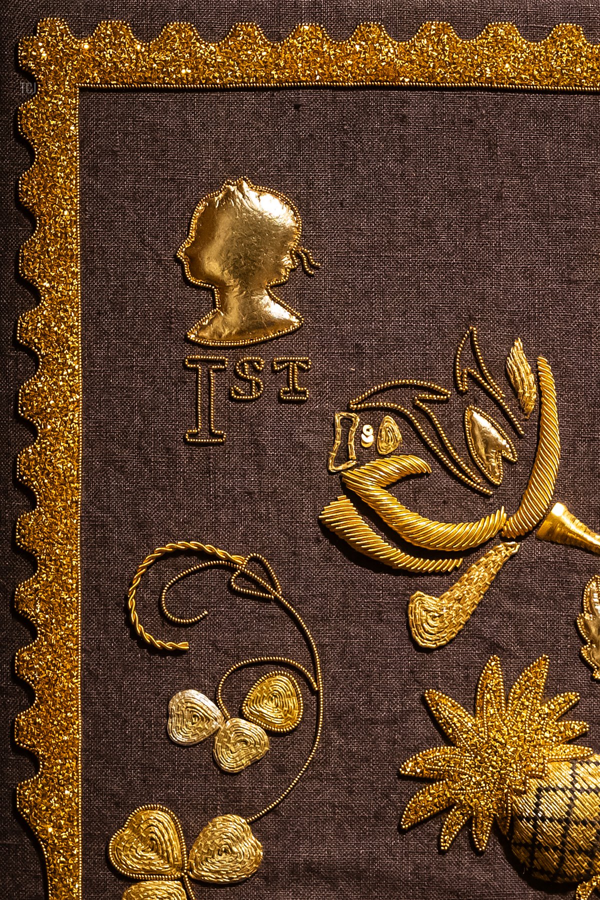 There’s more modern metallic embroidery featured in the exhibition, too. Here’s a close-up look at The Four Nations Stamp by Susan Ghosh.