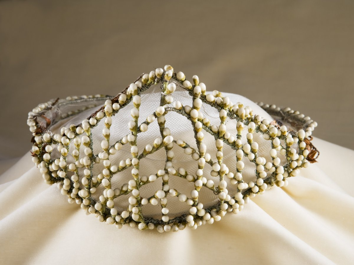 Rather than a traditional tiara set with gemstones, Lady Louise wore a floral headpiece to secure her veil. The headpiece was described by the Gentlewoman as “a Russian-shaped tiara of orange buds.” The piece’s metal lattice frame was wrapped in tulle and studded with floral buds. (This was also right on trend—see the floral headpiece worn a year earlier by Princess Mary for comparison.) The headpiece still exists today, preserved in the Royal Armoury museum at the Royal Palace in Stockholm. Her other jewels during the ceremony included a single strand of pearls. After the ceremony, she added even more pearls, putting on an impressive five-row pearl necklace with a diamond clasp, reportedly a wedding gift from the Swedish doctor Arvid Kellgren. She also pinned the Royal Family Order of her new father-in-law, King Gustaf V, to her gown.