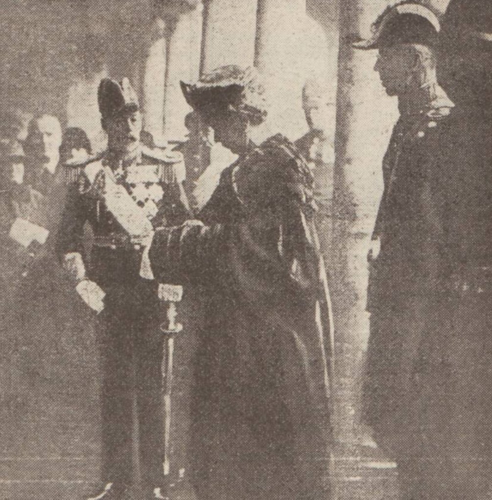 And here’s a brief glimpse of King George V and Queen Mary, with King Gustaf V of Sweden, arriving at St. James’s Palace for the wedding ceremony. King Gustaf had packed a fabulous gift for his new daughter-in-law: a “high diamond crown with points and rose centre.” (This is surely a reference to Queen Sofia’s Tiara, which Louise was pictured wearing from the early days of her marriage.) George and Mary gave Louise a jewelry gift, too: a “long-shaped diamond brooch, closely set with diamonds in delicate rows around a central stone.” There were even more jewels presented to the future Queen Louise of Sweden on the occasion of her wedding. Per the Western Morning News, Crown Prince Gustaf Adolf gave his new wife an intriguing suite of jewelry: “diamond and square-cut onyx drop earrings with [a] pendant single diamond in [the] centre of [a] pear-shaped ring, and a hair ornament in onyx and diamonds.”