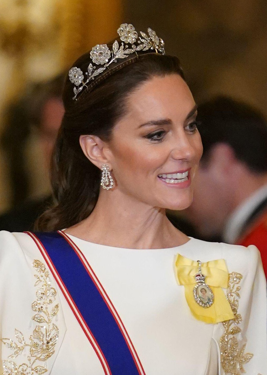 Kate wore an elegant embroidered evening gown from Jenny Packham with the sash and star of the Royal Victorian Order and the late Queen Elizabeth II’s Royal Family Order.