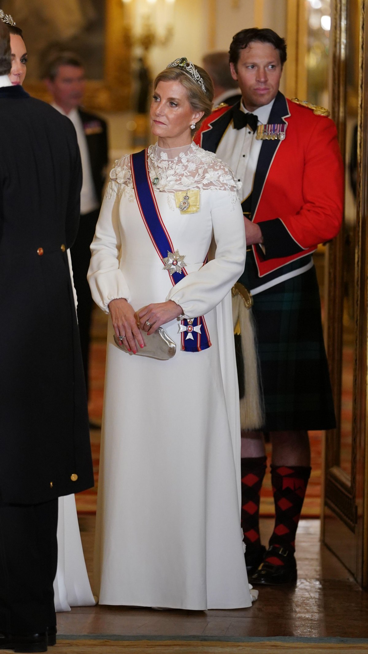 The Duchess of Edinburgh was elegant at the banquet in the same lovely gown that she wore for the coronation in May. She added the sash and star of the Royal Victorian Order and Queen Elizabeth II’s Royal Family Order to the dress.