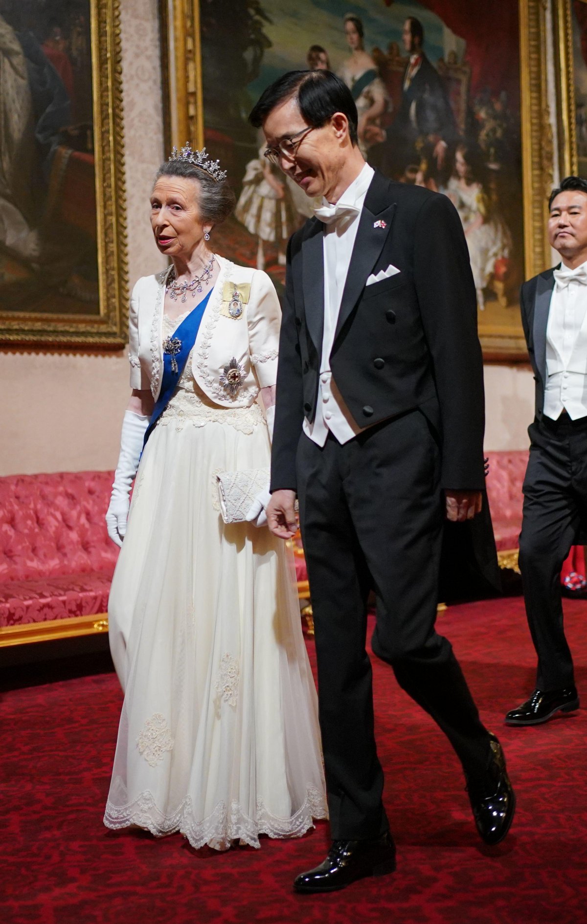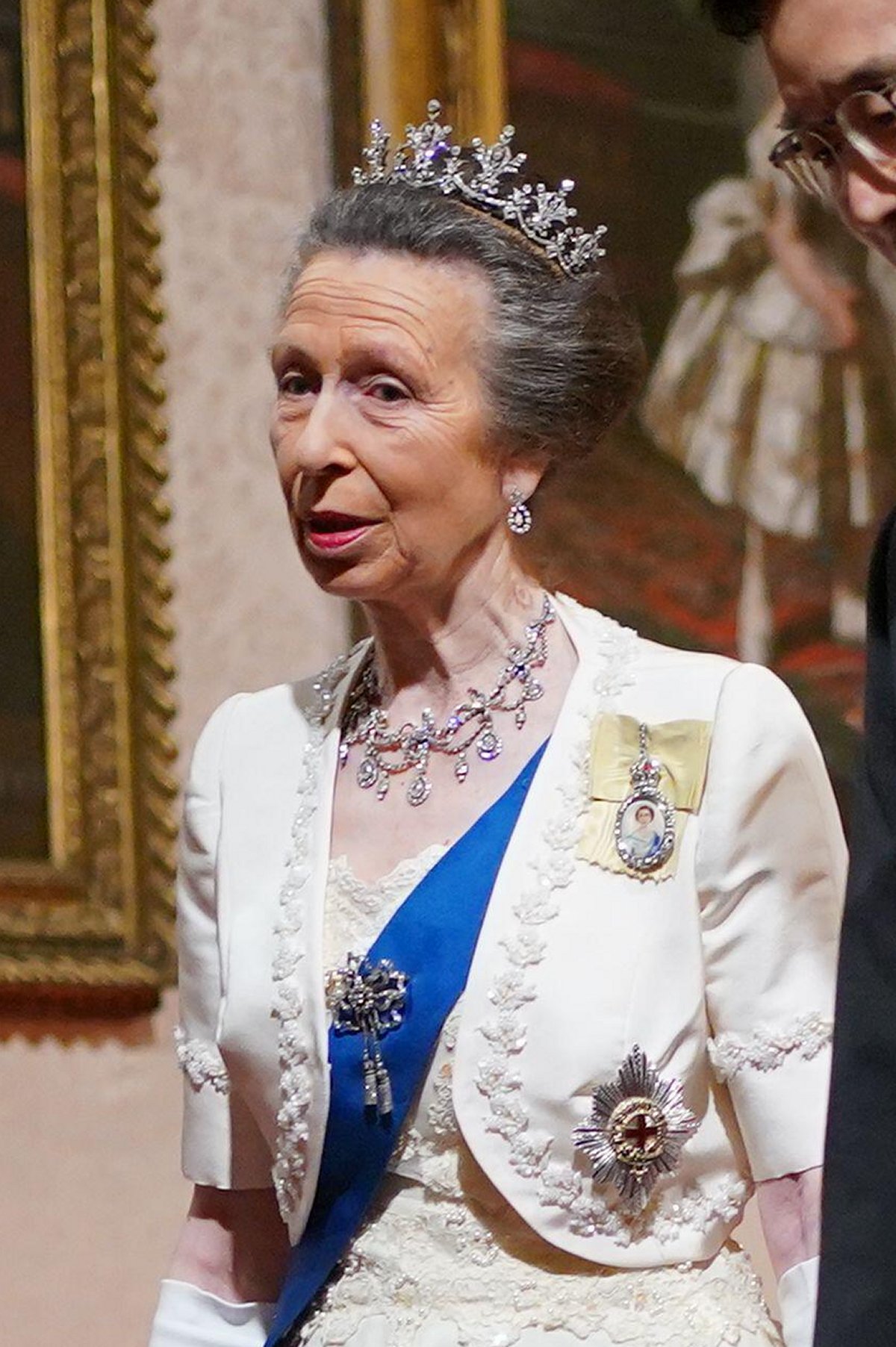 The Princess Royal also wore a white embroidered gown and jacket for the banquet, plus her Garter sash and star and her late mother’s Royal Family Order.