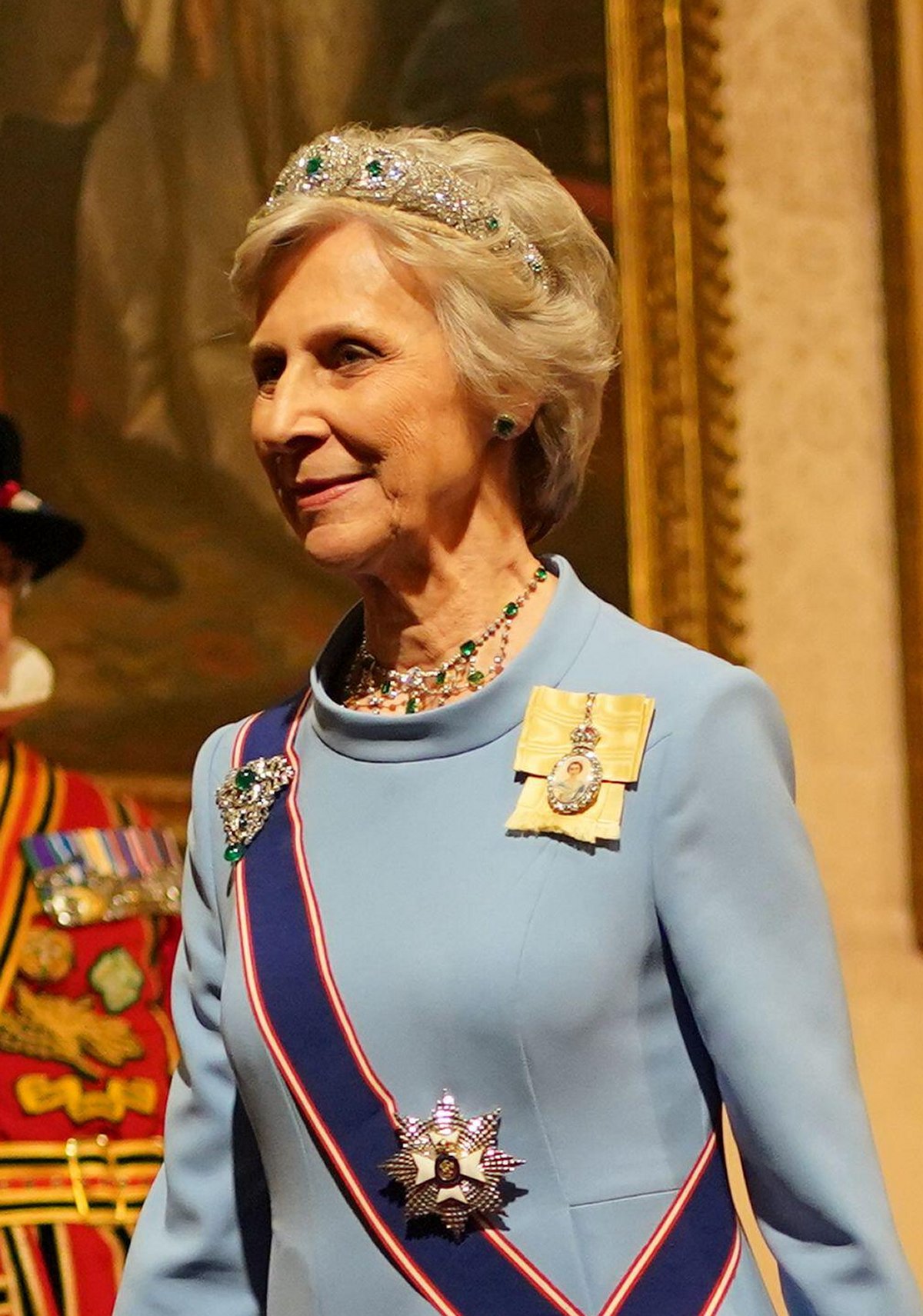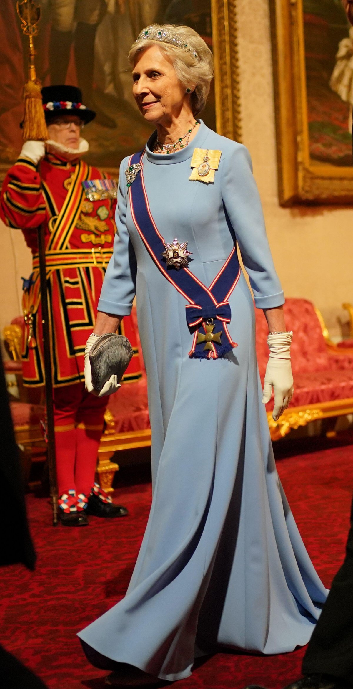 And here’s the Duchess of Gloucester, who wore a blue evening gown with the sash and star of the Royal Victorian Order and Queen Elizabeth II’s Royal Family Order.