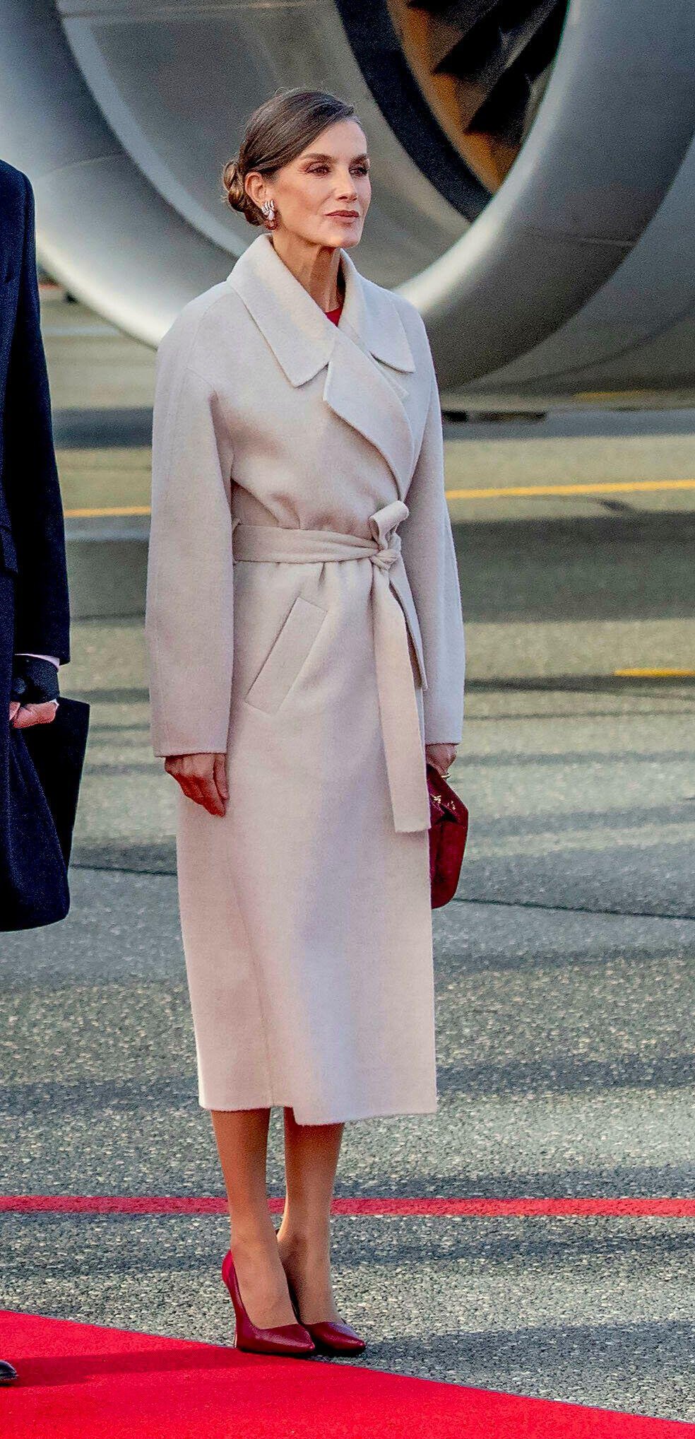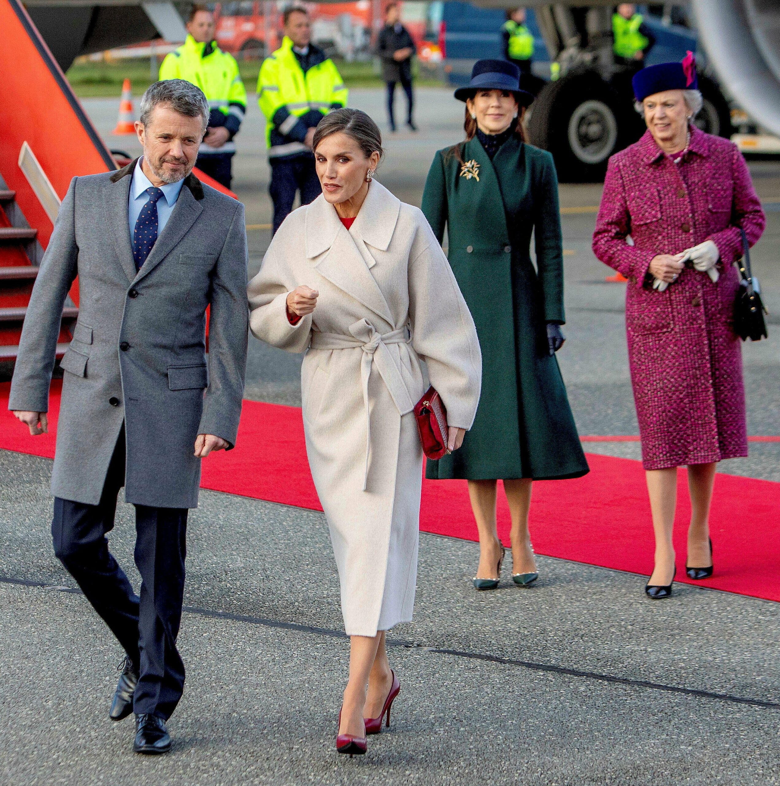 For her arrival in Denmark, Queen Letizia wore a red dress with matching accessories and a camel-colored coat.