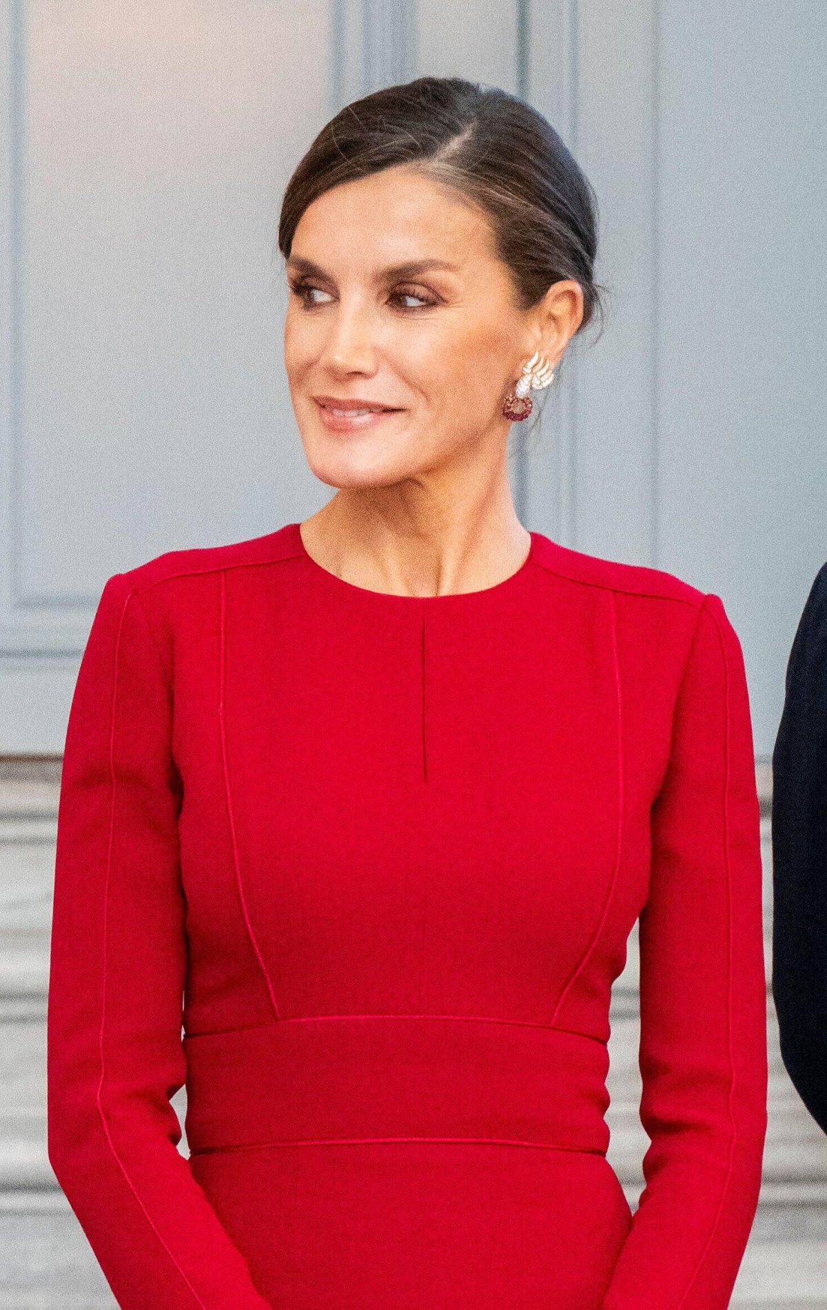 She added a favorite pair of earrings: diamond and ruby earrings in the shape of a dove holding a wreath. The jewels are part of a suite gifted to Letizia’s mother-in-law, Queen Sofia, by members of the Saudi royal family.