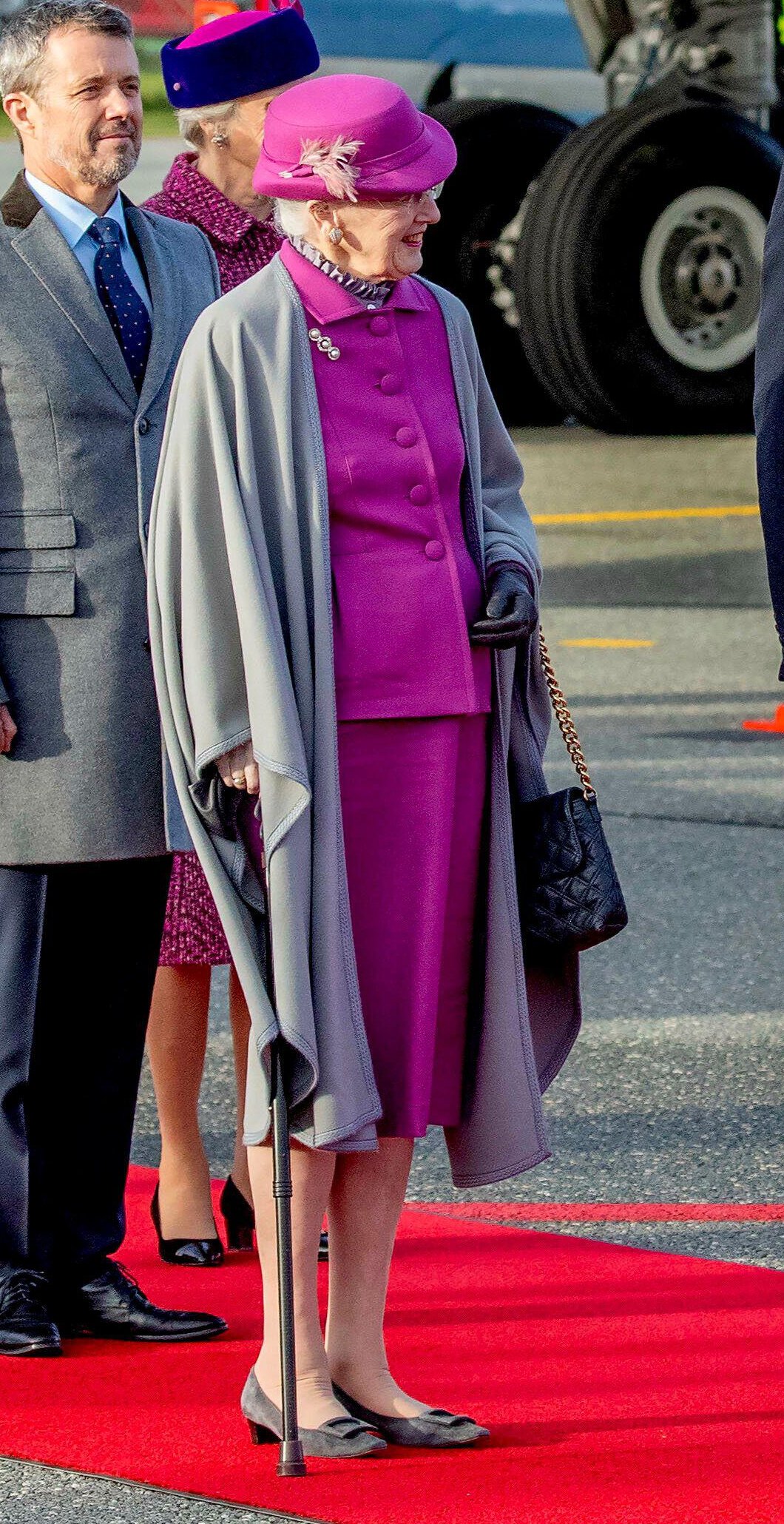 Queen Margrethe chose an ensemble in shades of fuchsia and gray for the arrival of her Spanish royal guests. (Like most of her European royal cousins, Felipe and Letizia call Margrethe “Tante Daisy.”)