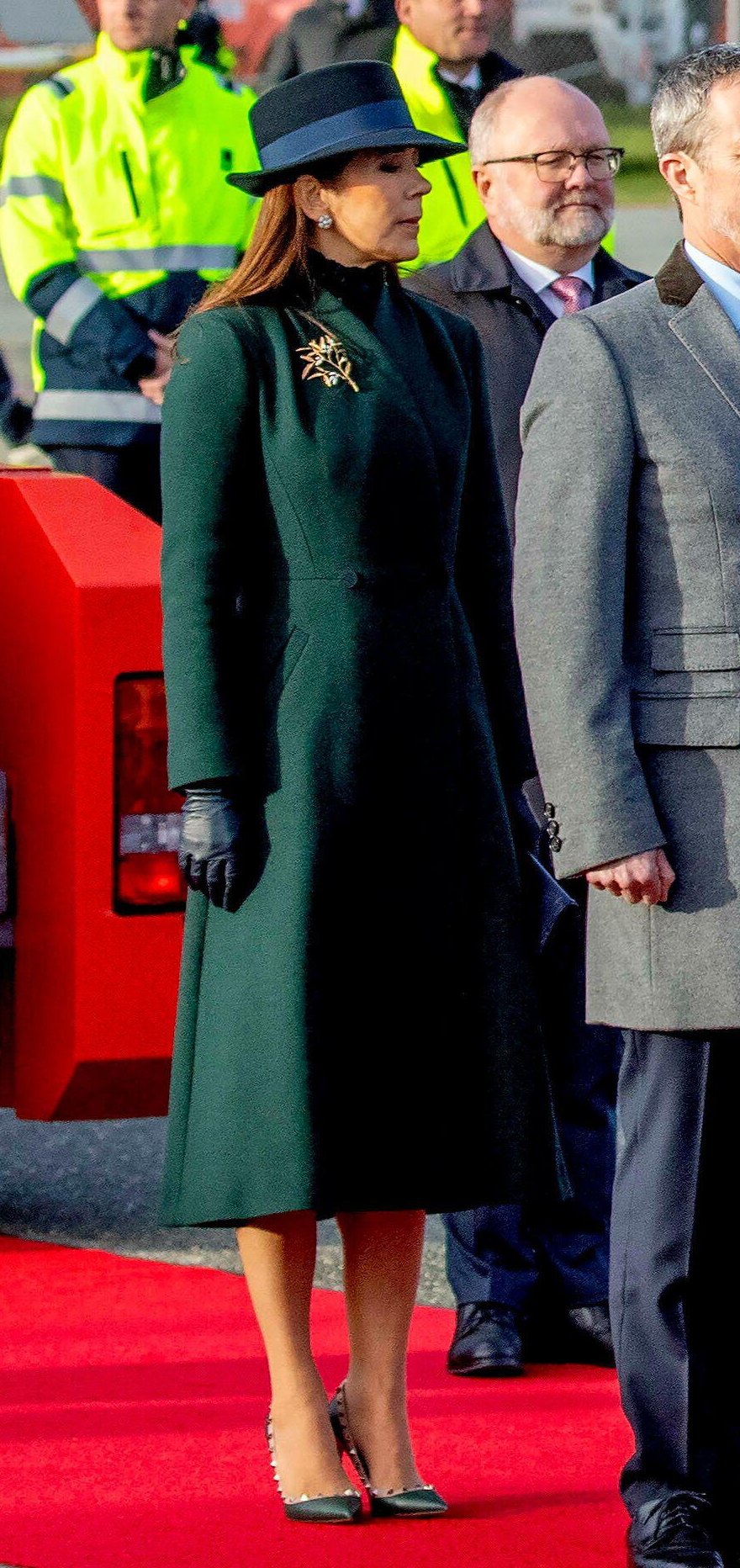 Crown Princess Mary was warmly dressed in a dark green coat with a coordinating hat for the arrival of the Spanish royals in Copenhagen.