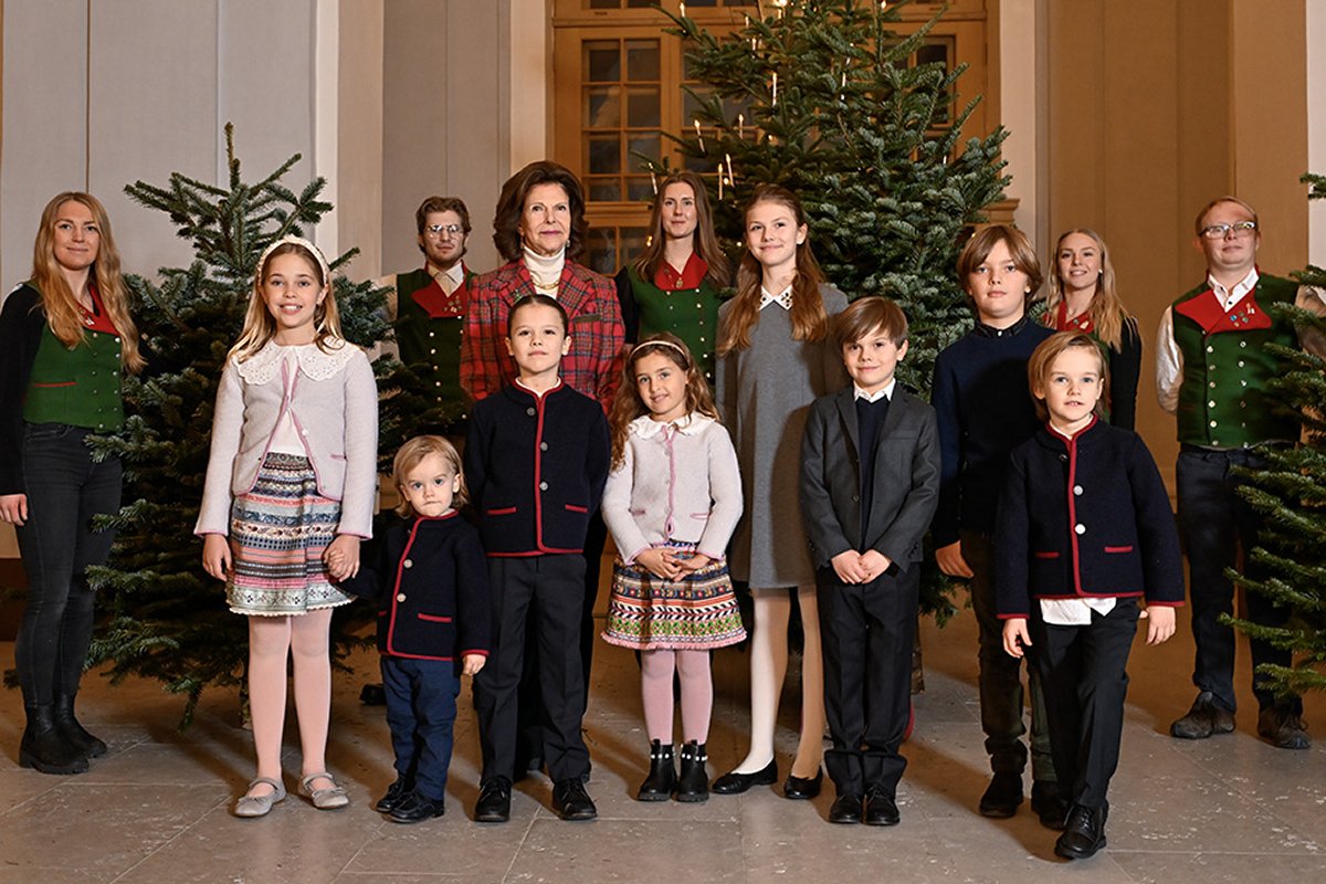 In Stockholm, Queen Silvia was surrounded by family as her 80th birthday celebrations approached. On December 18, she was joined by all eight of her grandchildren—Princess Estelle and Prince Oscar, Prince Alexander, Prince Gabriel, and Prince Julian, and Princess Leonore, Prince Nicolas, and Princess Adrienne—to receive the traditional Christmas tree delivery at the Royal Palace.