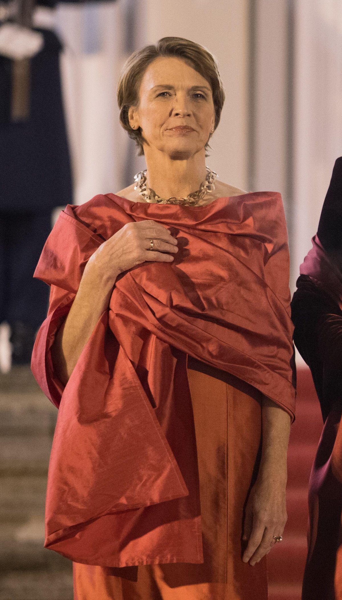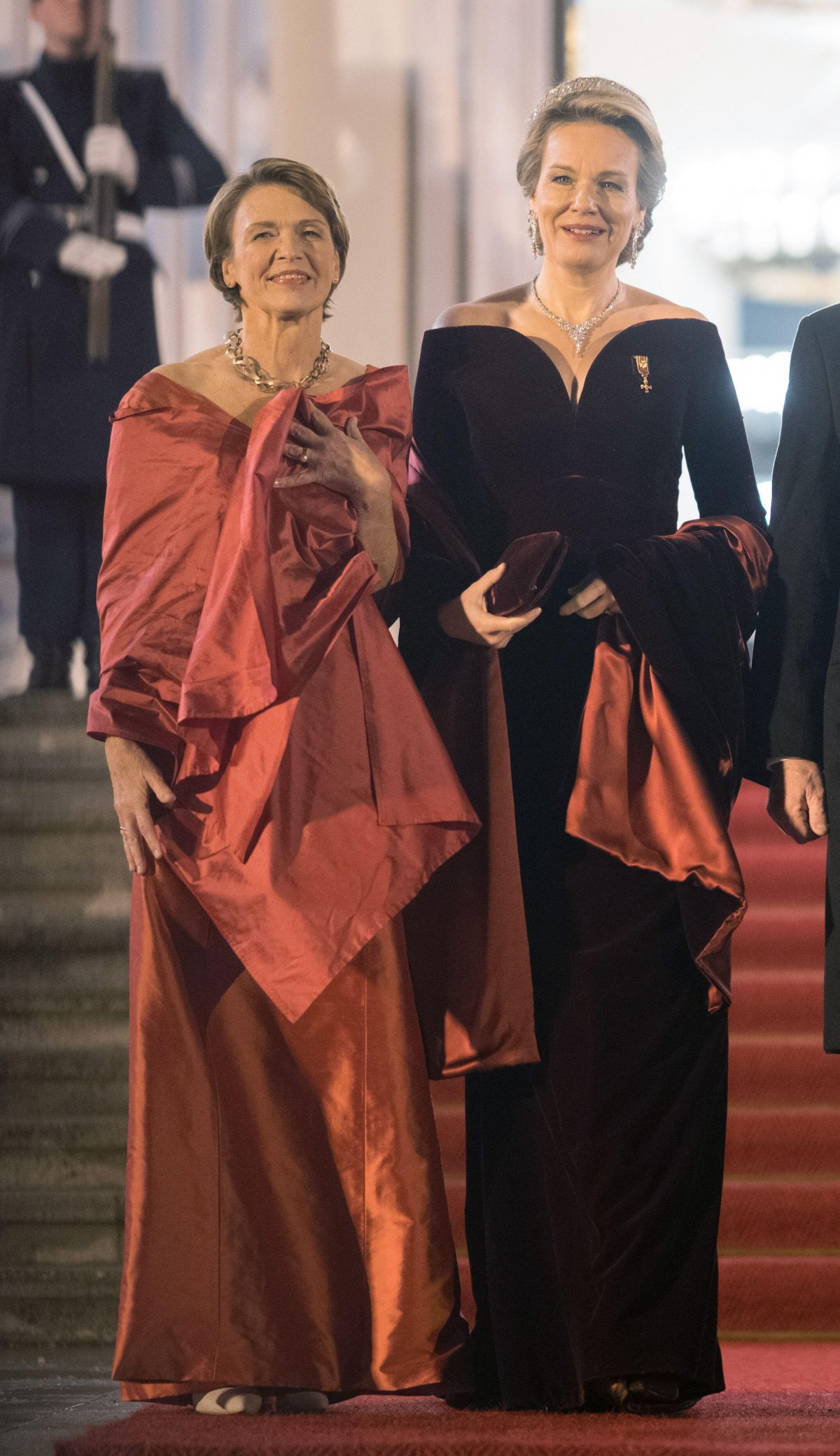 Both ladies were resplendent in autumnal colors for the banquet, with Ms. Büdenbender in a rust-orange ensemble and Queen Mathilde in deep red velvet. Her dress, with its dramatic off-the-shoulder sweetheart neckline, comes from Armani Privé.