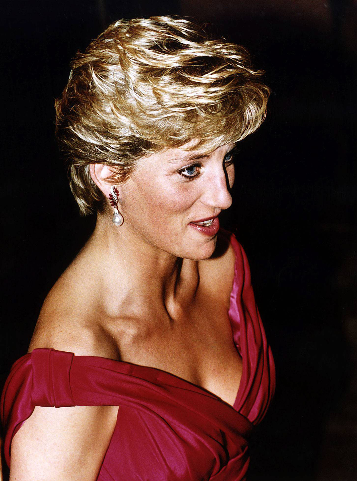 Speaking of earrings, Diana also wore this pair of modern ruby and diamond earrings with pearl drops on numerous occasions for receptions, premieres, and galas. Above, she sports them for a visit to the opera in Tokyo during the 1990 trip to Japan to witness the enthronement of Emperor Akihito. Technically, Kate has worn half of these earrings already: she uses these pearl drops with the diamond studs from Diana’s horseshoe and laurel earrings. But I’d really like to see her try out the ruby and diamond stud portion, too!