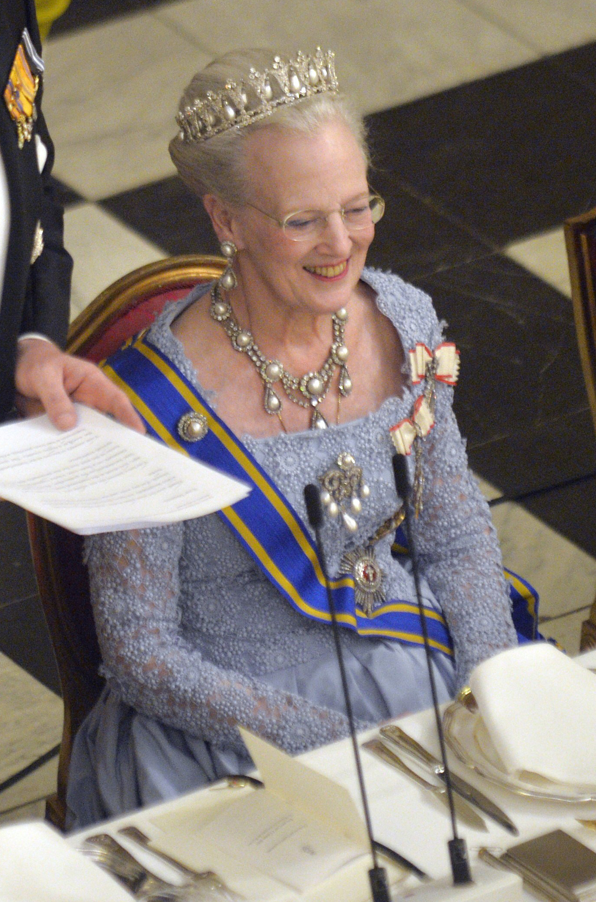 The pearl tiara and coordinating jewels have been worn by each Queen of Denmark since: Queen Alexandrine, Queen Ingrid, and Queen Margrethe II. Indeed, Queen Ingrid handed the parure over to Queen Margrethe almost immediately after her accession to the throne in 1972. Margrethe wore it for her first official portraits as monarch and for several early gala appearances, and she’s continued to wear it often ever since.